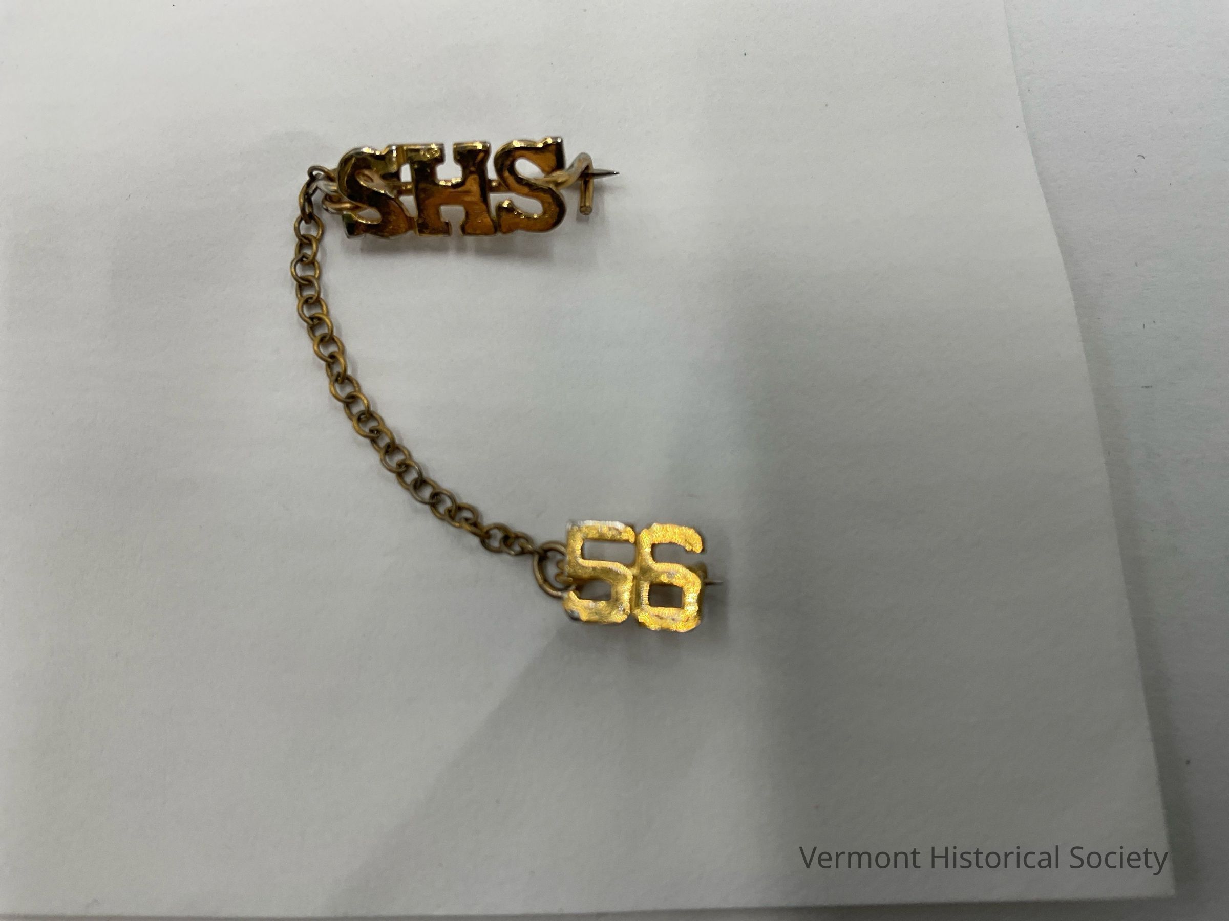 Two-piece pin consisting of the initials SHS and the number 56 connect by a short chain. The two parts are each backed with a hinged pin.