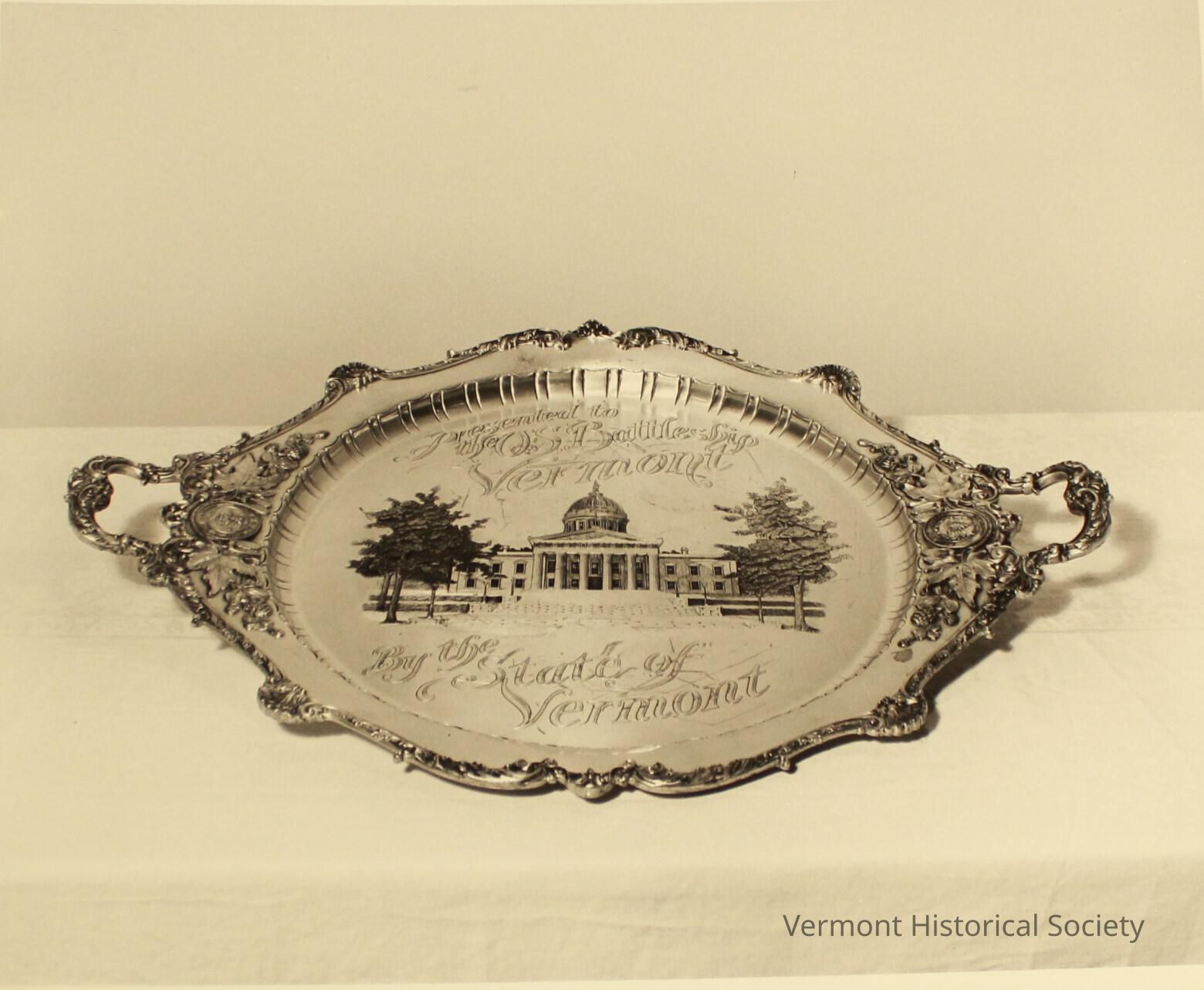 Large, oval silver platter with decoratively molded outer edge. The center is engraved with an image of the State House and the inscription, "Presented to the U.S. Battleship Vermont / By the State of Vermont".