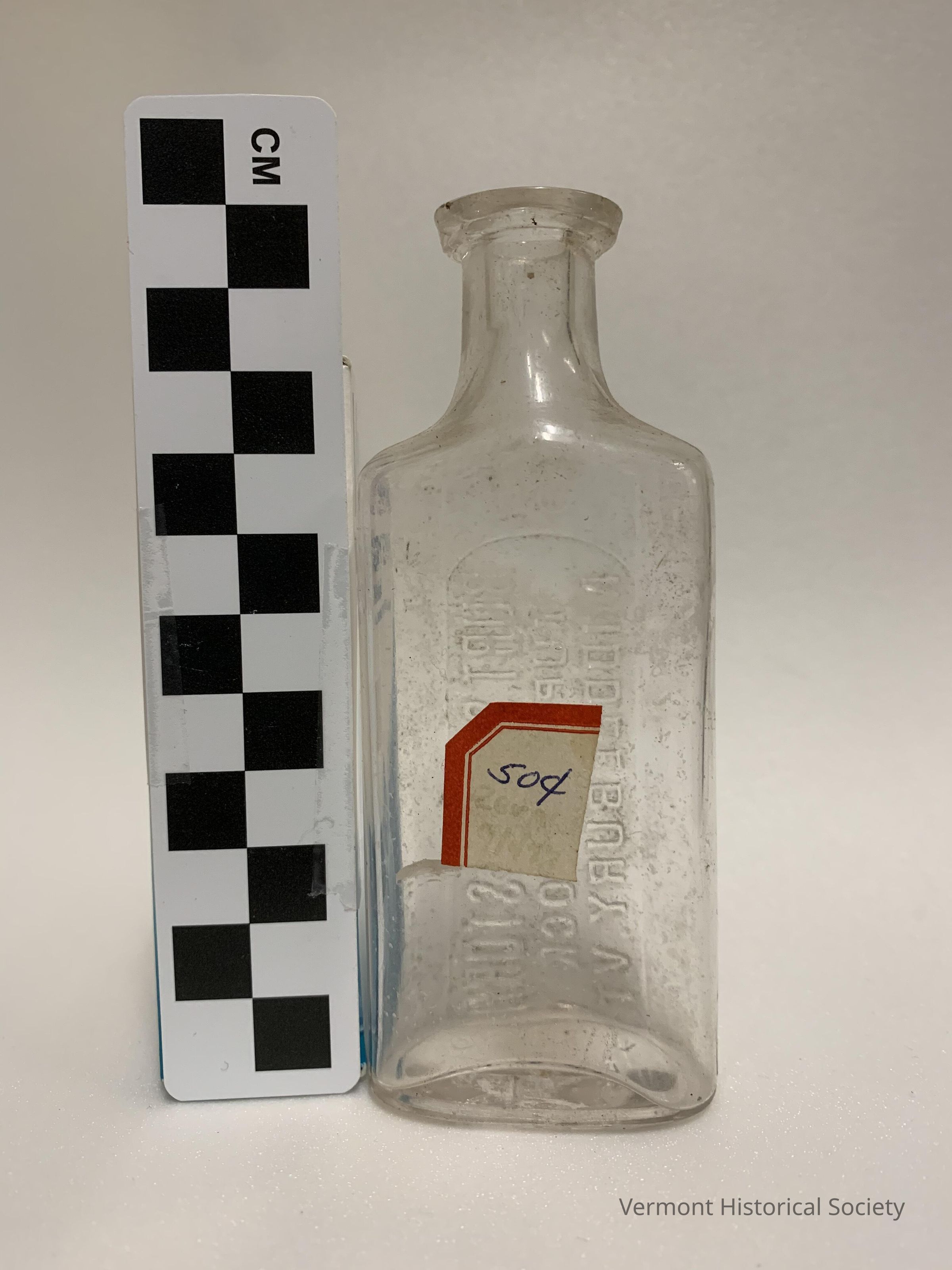 Clear molded glass bottle bearing the molded inscription, "BURT'S DRUG STORE/TUPPER BLOCK/MIDDLEBURY, VT." The base bears the molded inscription, "W. T. CO./E/U. S. A." A sticker made of the corner of a larger, red-bordered label bears in the inked inscription, "50[cent symbol]".