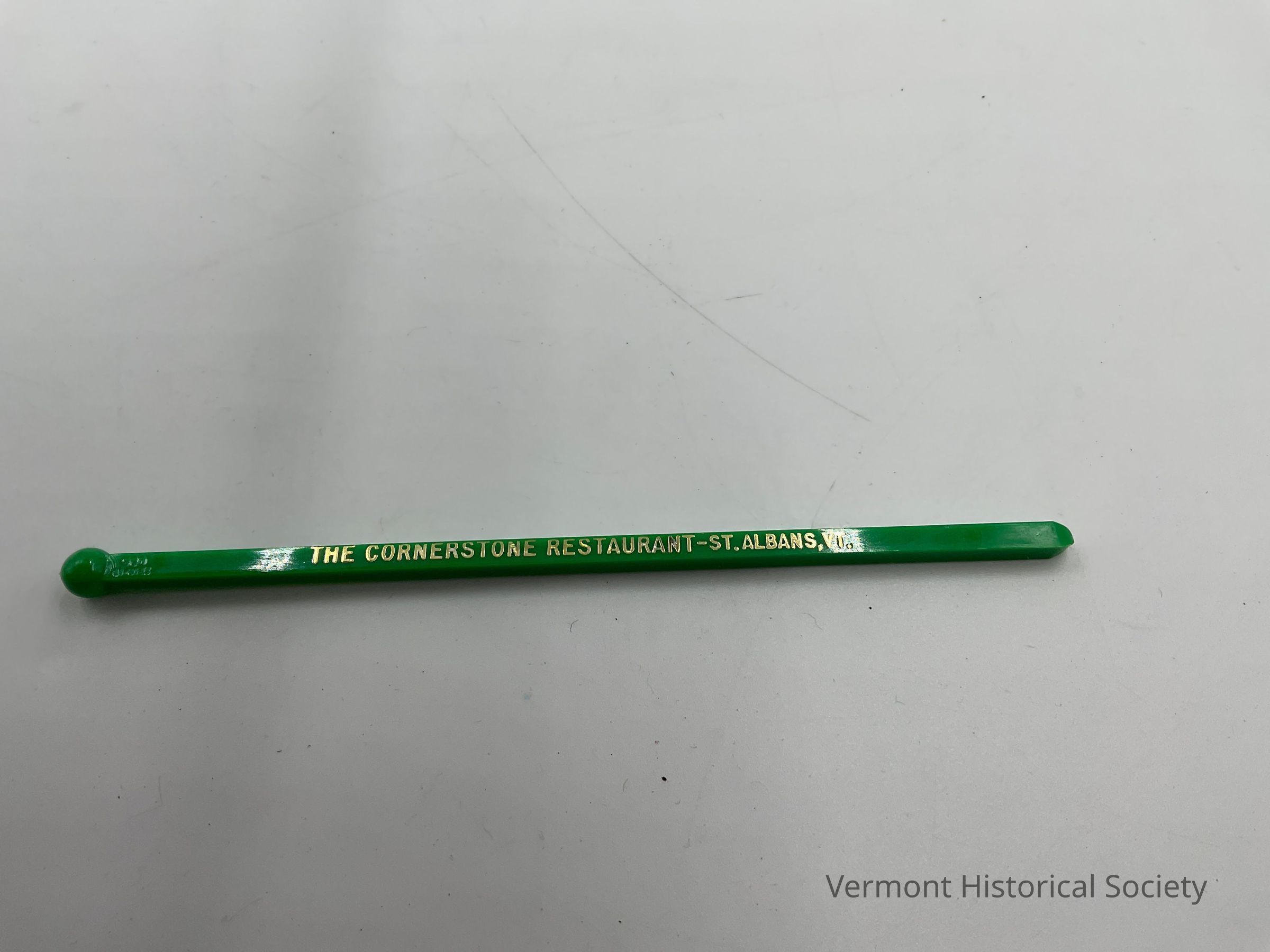 Green swizzle stick printed with the label, "THE CORNERSTONE RESTAURANT - ST. ALBANS, VT."