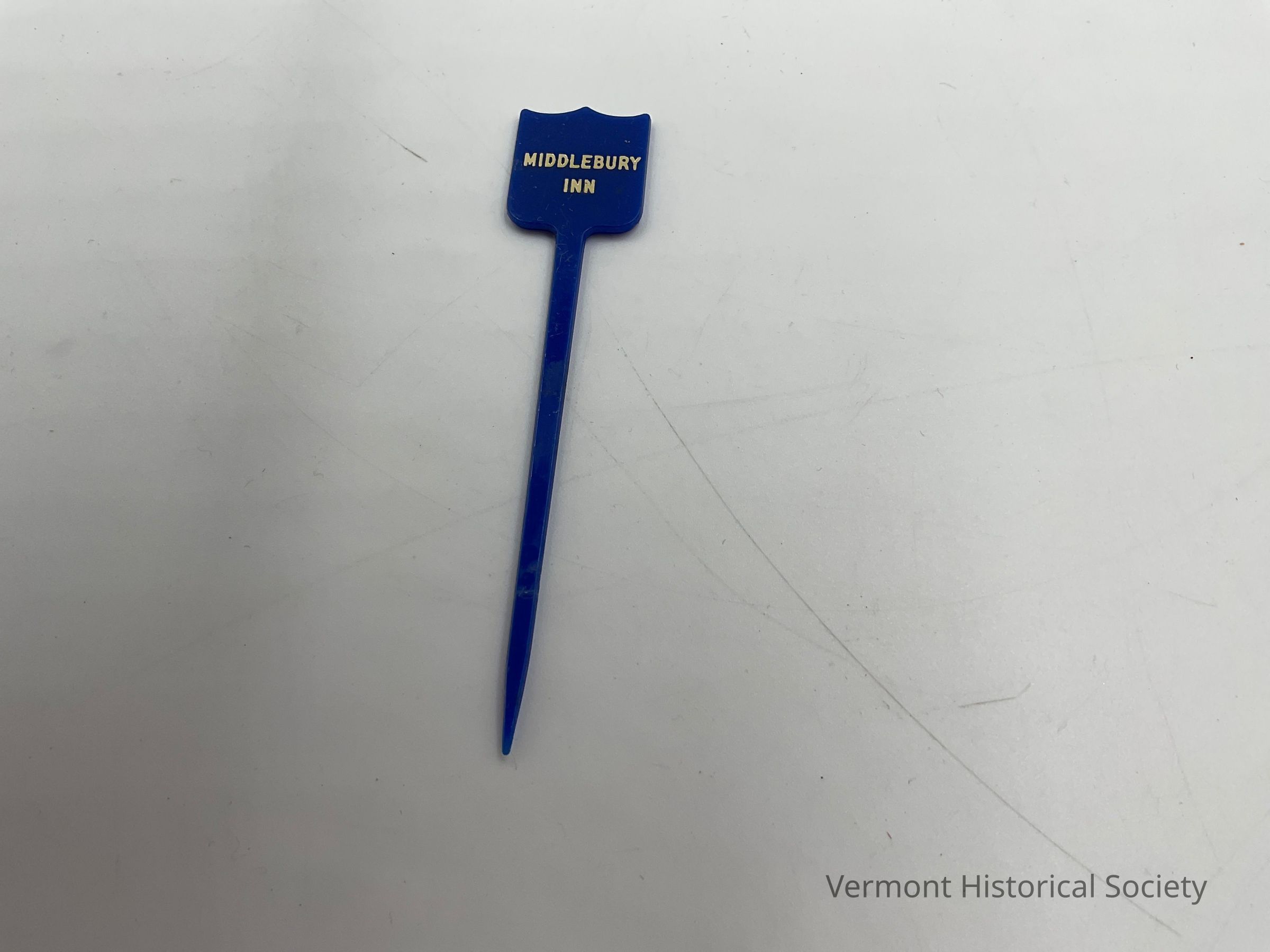 Blue swizzle stick. The top is shaped like a shield and printed with the words, "MIDDLEBURY INN".