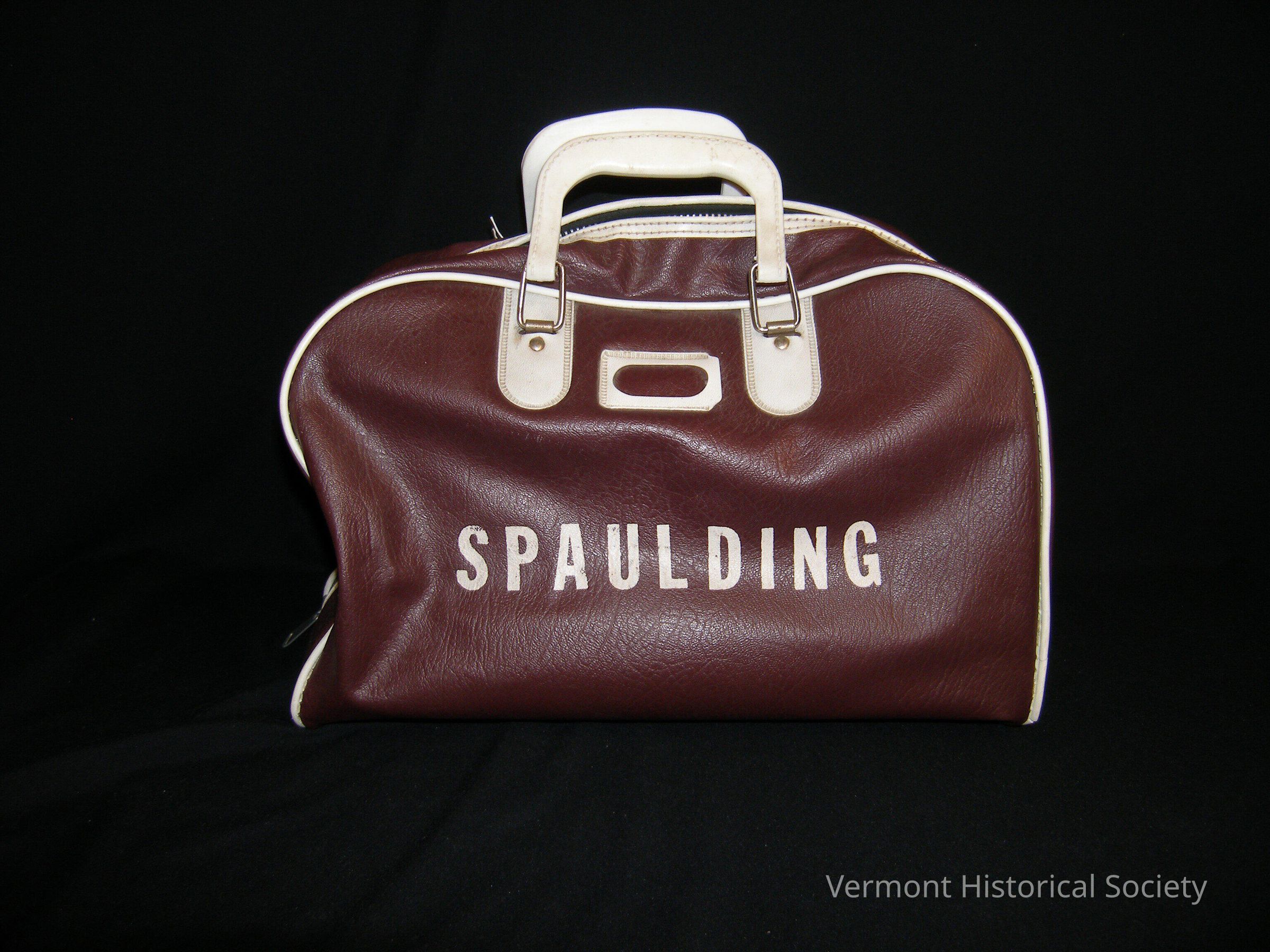 Burgundy leather zippered gym bag with white piping along the seams and white plastic hinged handles. One side is printed with the word "SPAULDING" and has a white tag holder between the handle attachments. The bottom has four rounded metal feet.