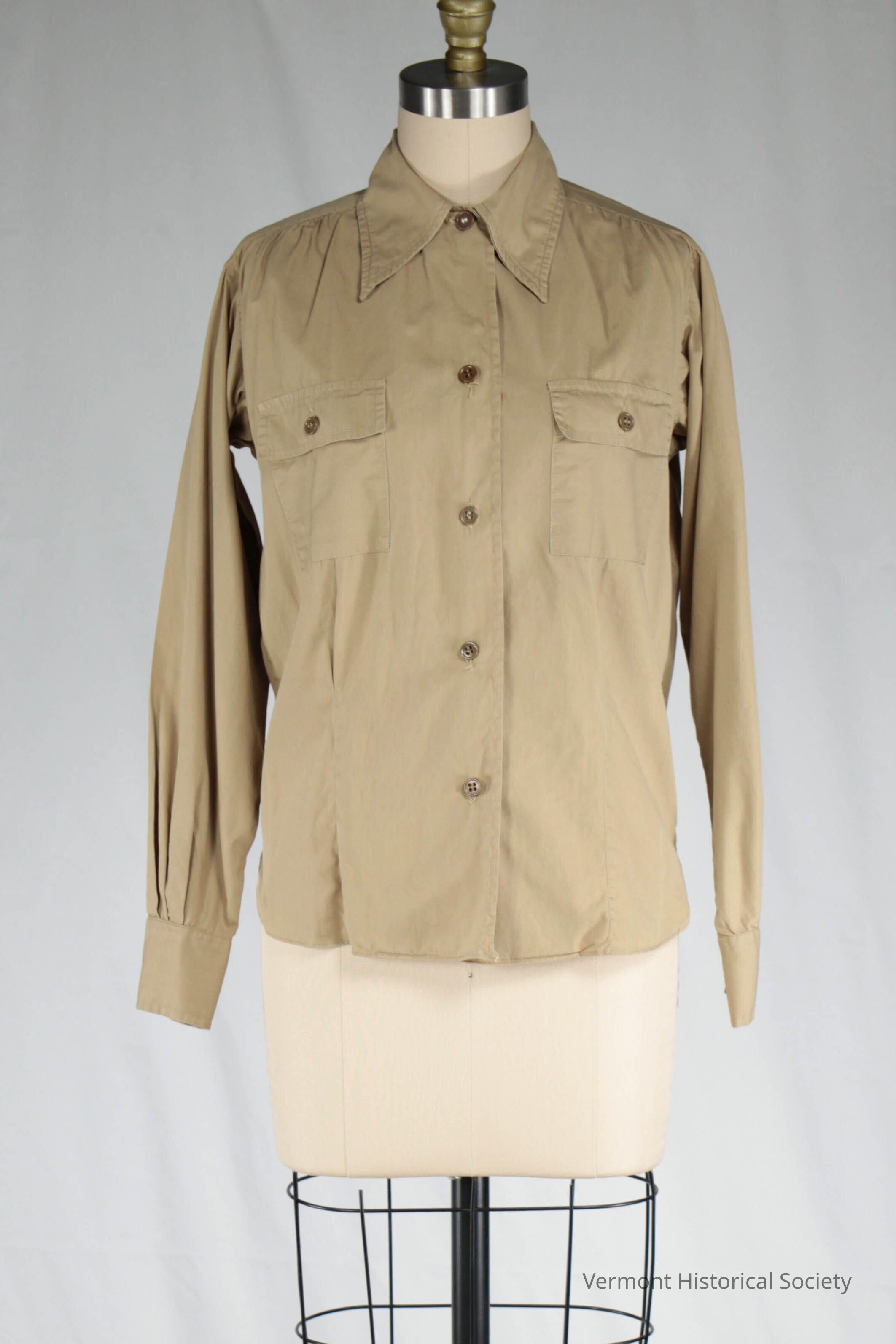 Kakhi button-down uniform shirt. The shirt has a pointed falling collar and secures down the center front with 5 buttons. There is a flap pocket at either breast. The shirt has long sleeves that end in cuffs.Context