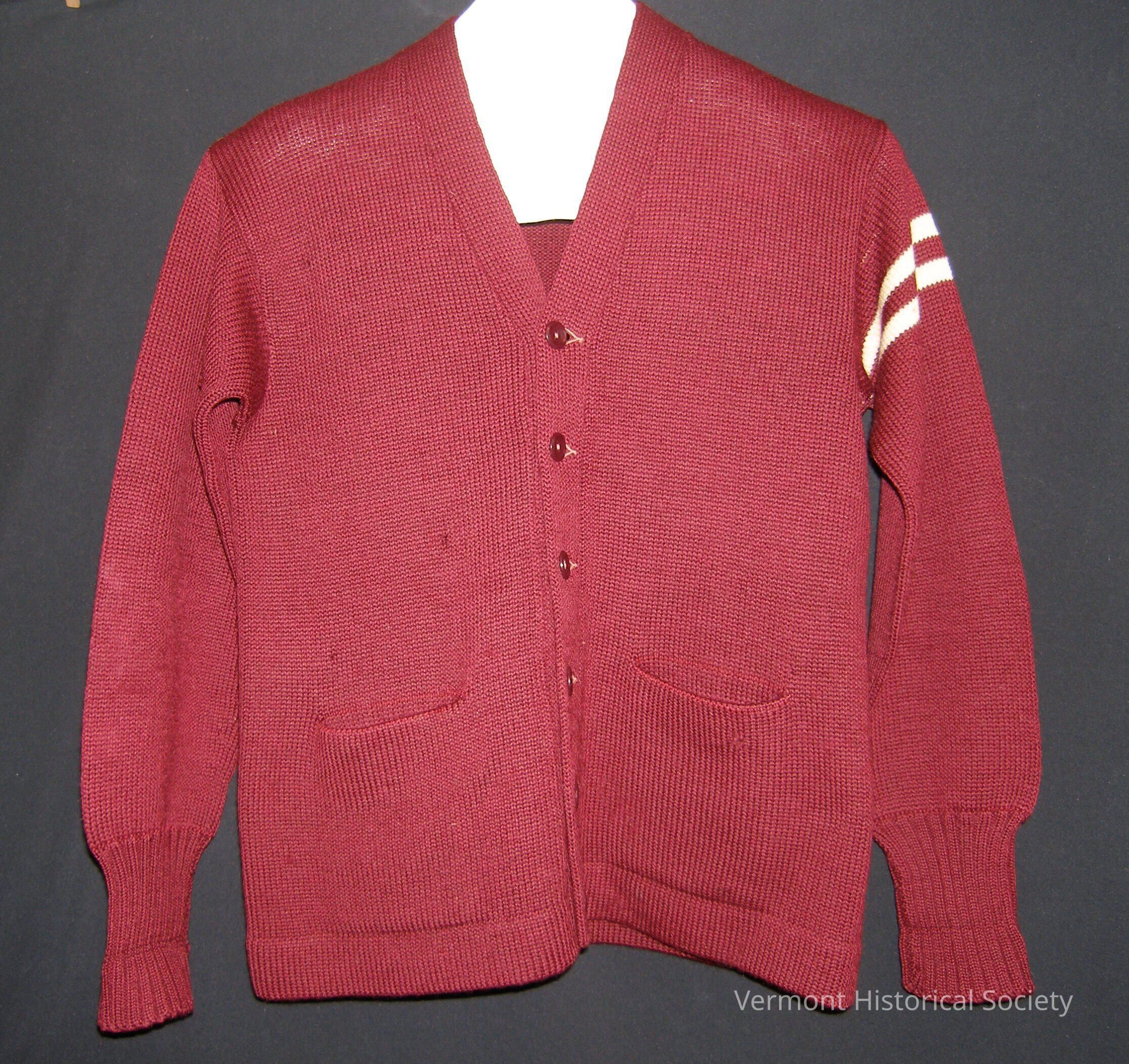 Maroon knit letter sweater with two white stripes on the left arm. The sweater secures down the center front with 6 red plastic buttons, and there are two pockets at the front hip. A varsity letter was attached to the right front breast, but is now detached. The letter is in the shape of an S in gothic script and made of looped pile wool on white felt lined with plain-woven white cotton.Context