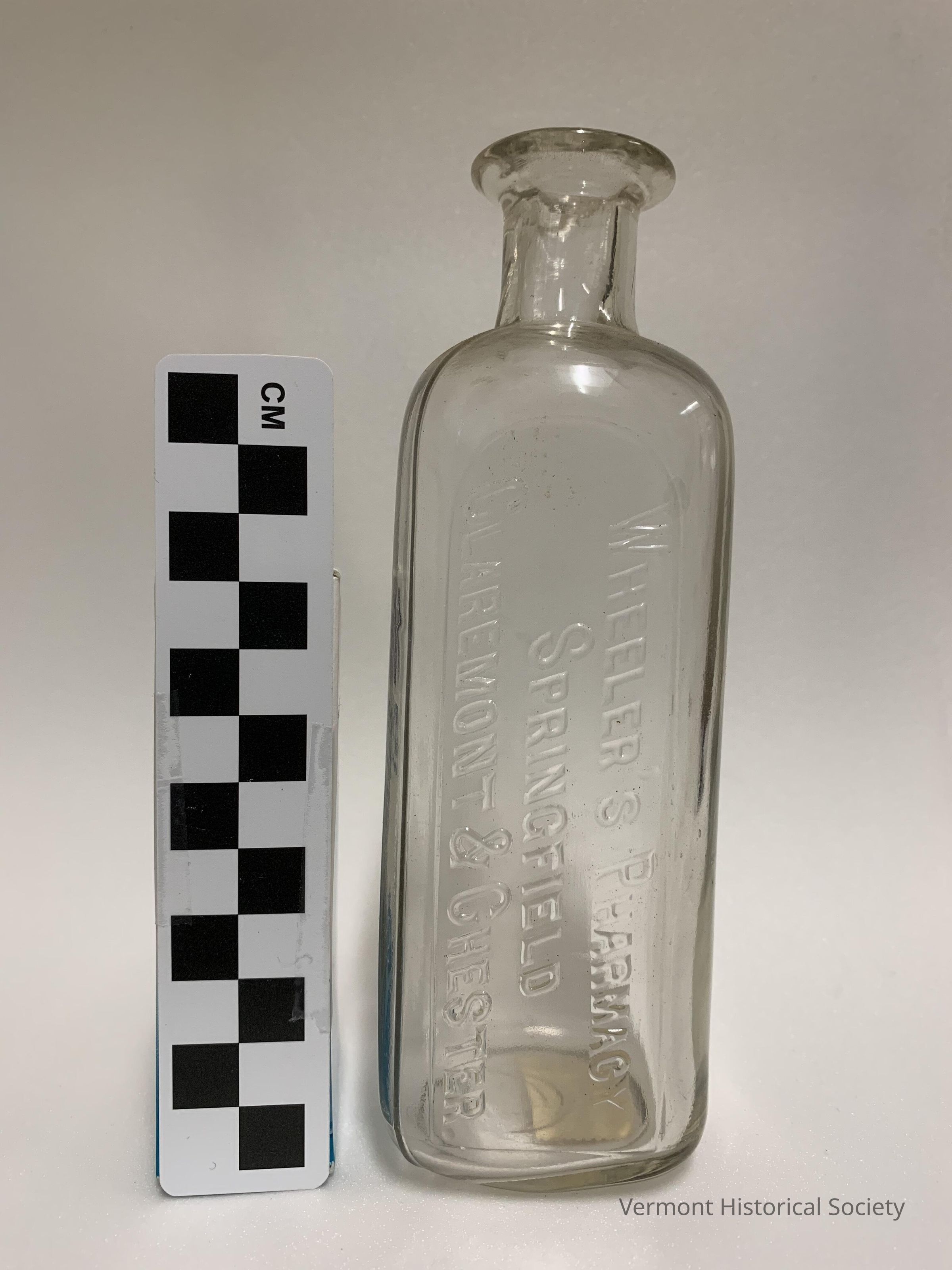 Clear molded glass bottle with four even-widths sides. The face bears the molded inscription, "WHEELER'S PHARMACY/SPRINGFIELD/CLAREMONT & CHESTER". A paper sticker on the base bears the inked inscription, "3/12/71 / Marlboro Vt- / $150".