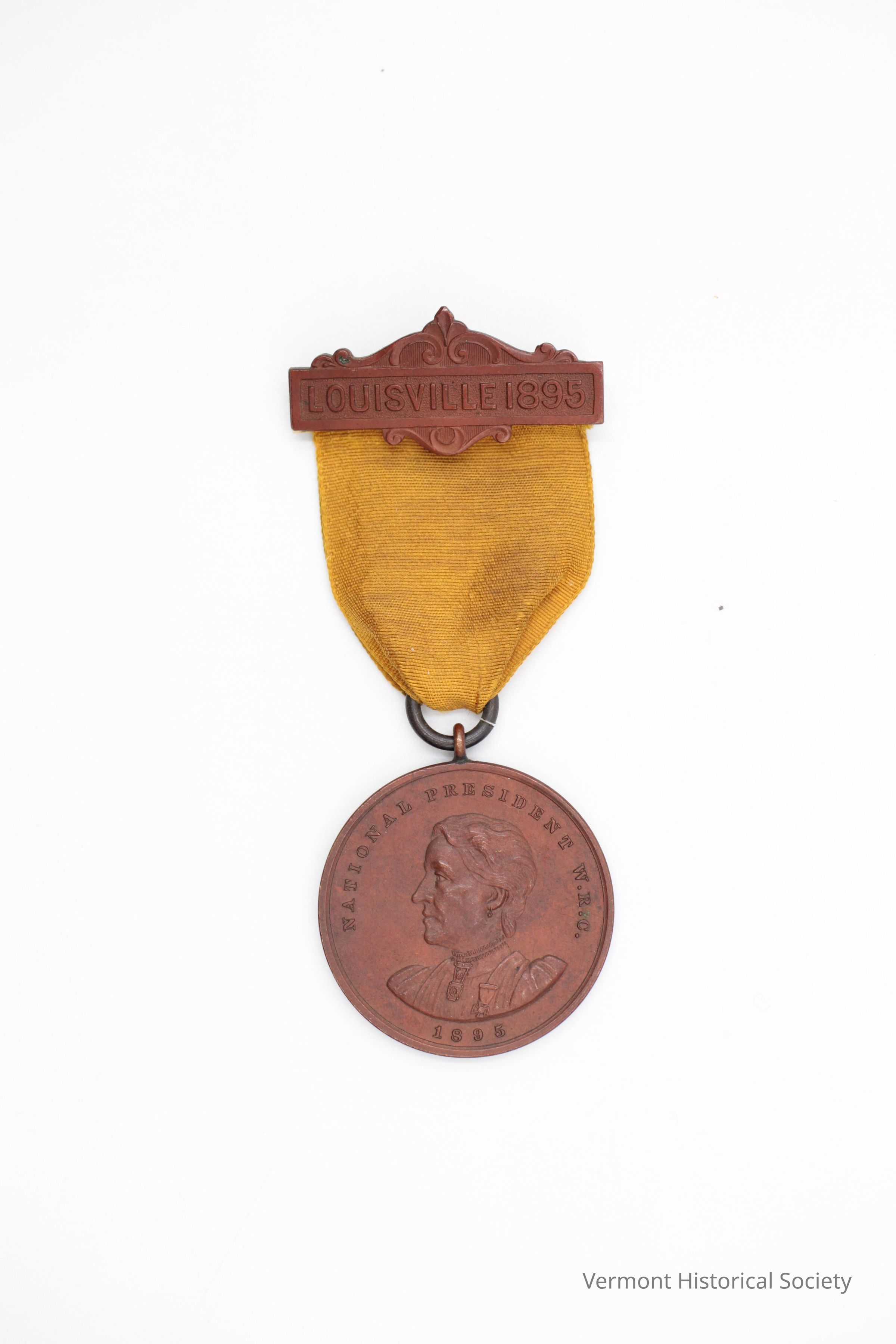 Membership ribbon consisting of a rectangular bar, a yellow ribbon, and a round medallion. The bronze bar has decorative scrollwork and the inscription, "LOUISVILLE 1895". There is a hinged pin on the reverse. A yellow grosgrain ribbon is looped and stitched onto a wire on the back. From an eye hook looped through the bottom of a ribbon hangs a round bronze medallion showing the bust of a woman with the inscription, "NATIONAL PRESIDENT W. R. C. 1895".