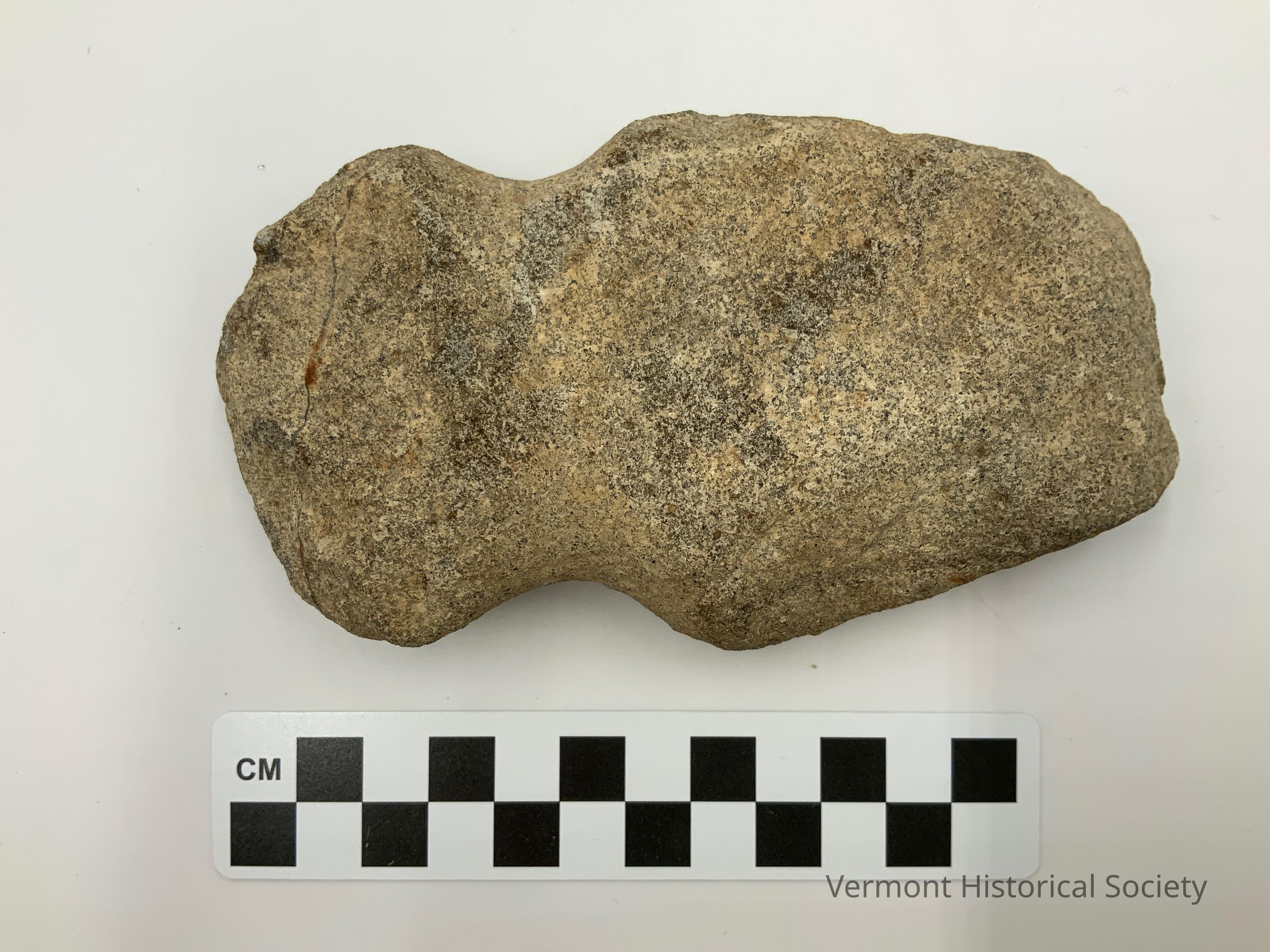 Ground stone ax head with a full groove on one side. The other side is ungrooved. There edges and base are chipped.Context