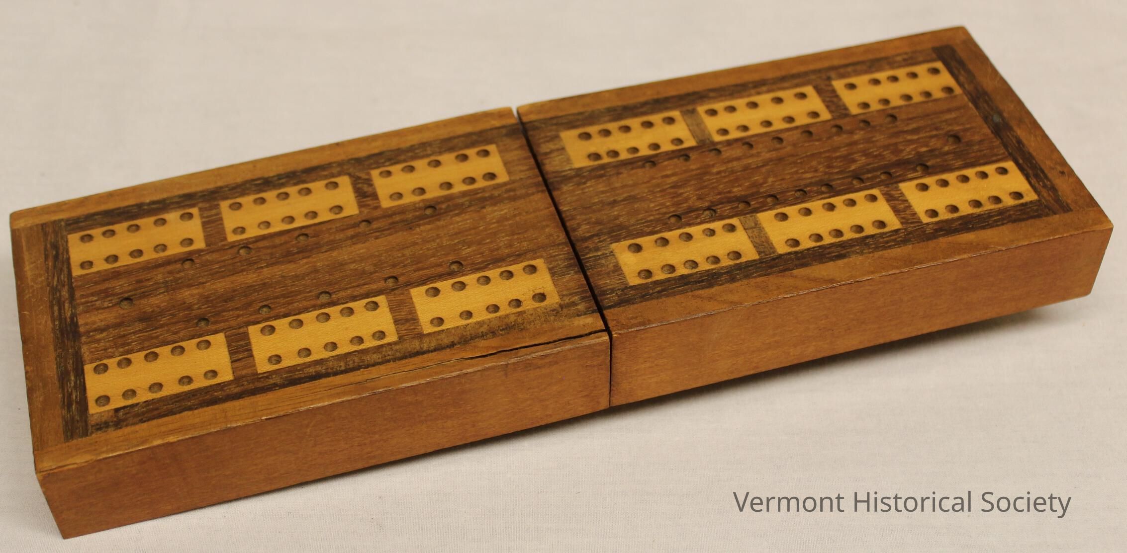 Rectangular wooden cribbage board hinged at the center. When closed, the board forms a box with the cribbage board on the outside. The board consists of 12 light-colored rectangles of inlaid wood, each drilled with 2 rows of 10 holes. In the center of the board, between the 2 rows of inlay, is an oval formed from 30 drilled holes. The inside of the box, or back of the board, islined with paper printed in red and black with the symbols of standard playing card suites (heart, diamond, club, spade) in a repeating tiled pattern. There is a pointed wooden divider at one end. When closed, the box secures with a metal hook.Context