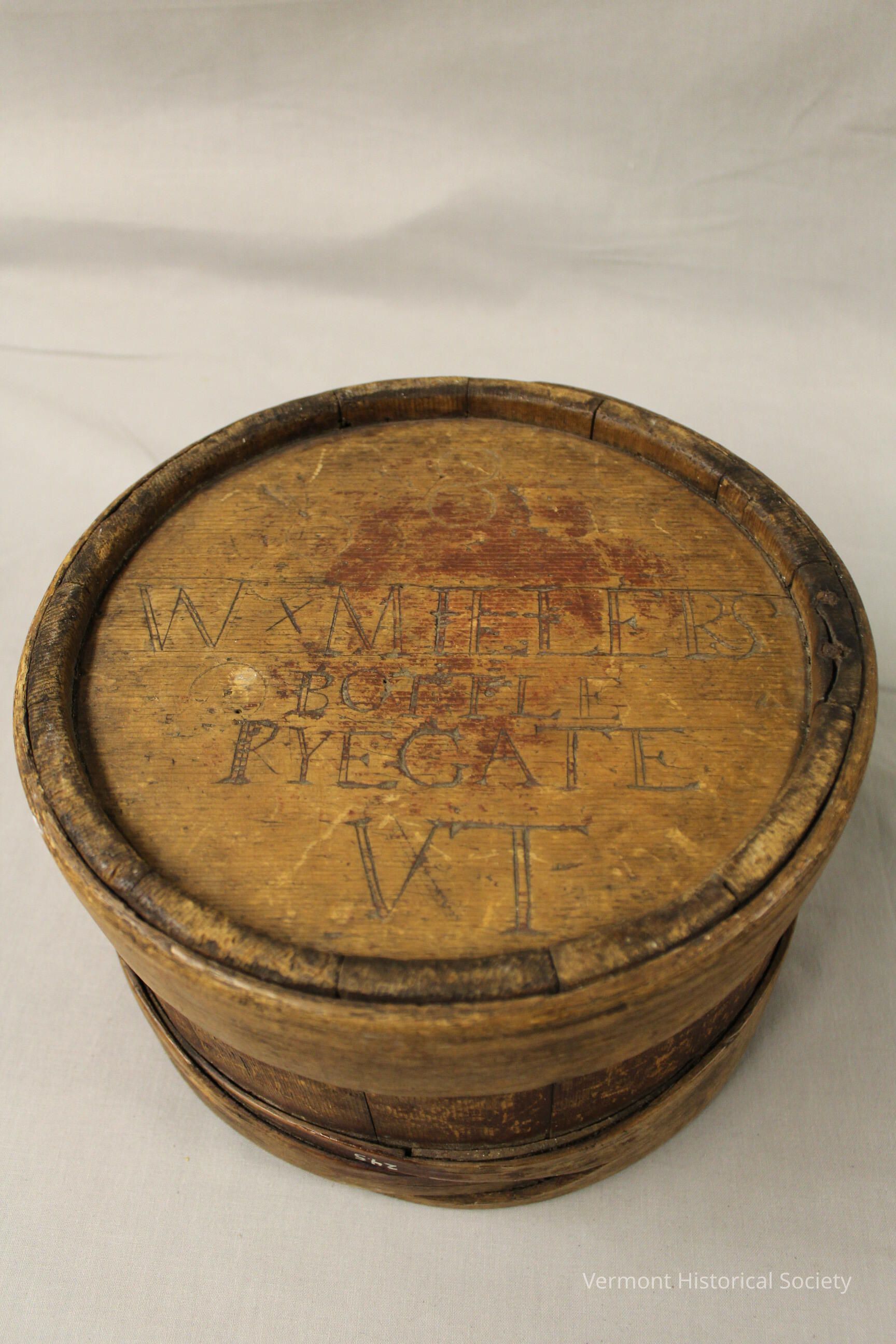Wooden, barrel-style canteen or water bottle. The canteen is circular with flat sides. One sides is etched with the inscription, "W x MILLERS BOTTLE RYEGATE VT". The back is inscribed, "JAMES JAMES FIELD". At the top is a small board between the side hoops with a hole drilled through for inserting a spout or cork. There is another, smaller hole near it to allow airflow.Context