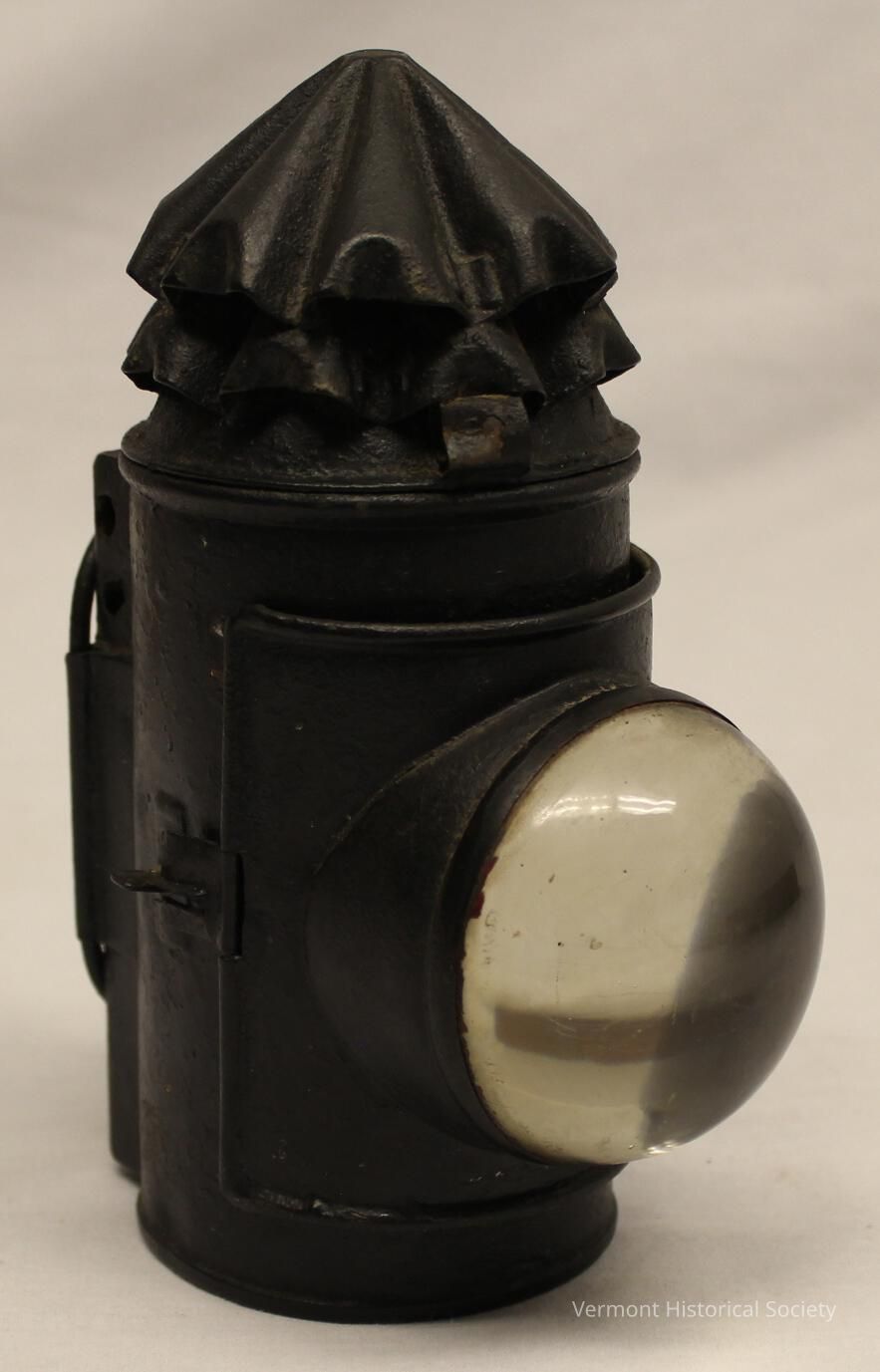 Black metal lantern with a door on hinges that latches shut. The door holds a large, thick, clear convex glass lens to magnify the light. The interior should have a separate fuel container with a wick, but it is missing from this lantern. Two heavy metal oblong loops on hinges allow the lantern to be held, or possibly attached to a belt. The top is a ruffled conical shape, 2 layers, which allows for venting.Context