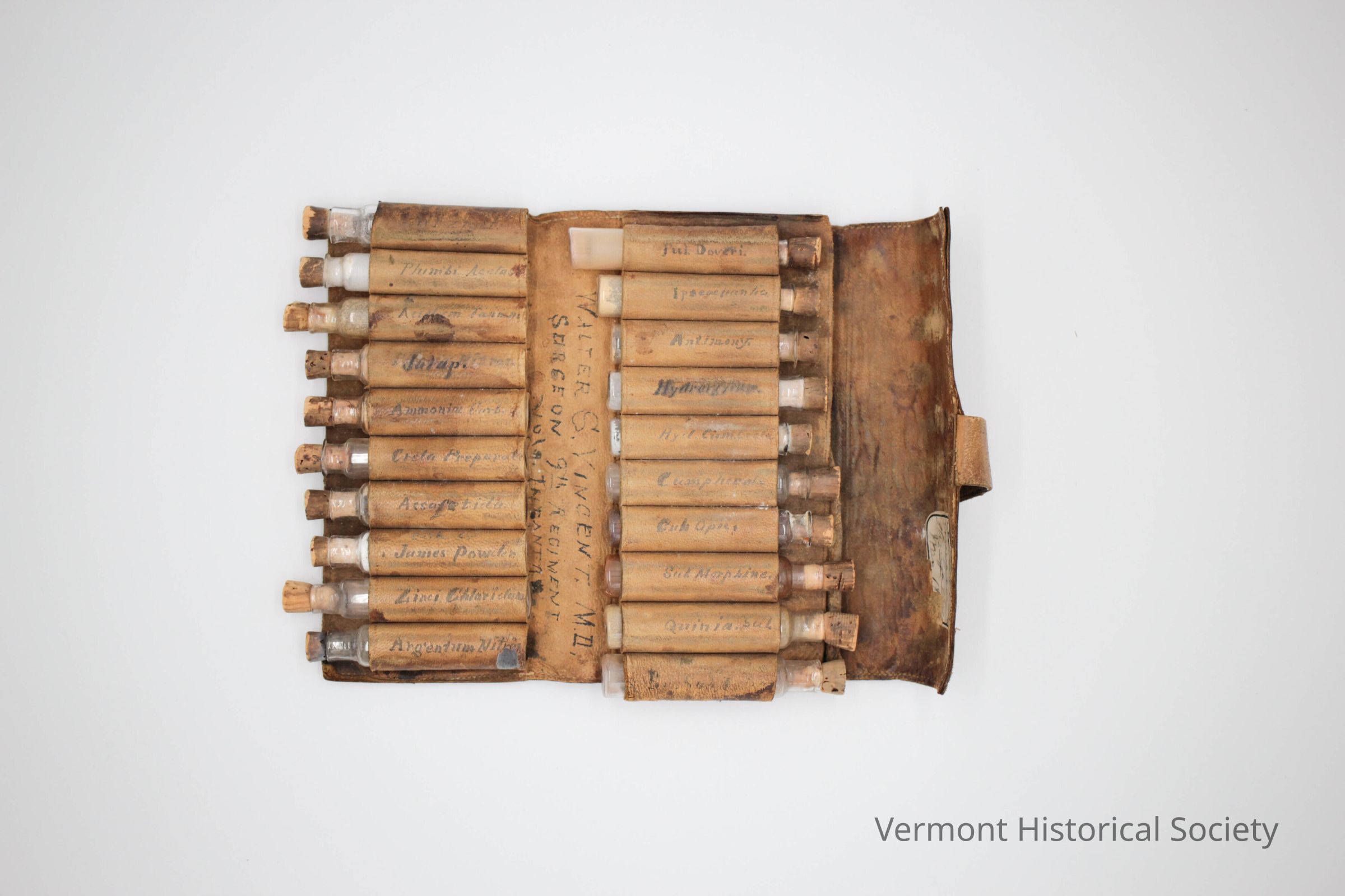 Leather case with glass vials of medicines. The case rolls together and closes with a flap, a strap wrapping around the case and securing into a slit. Inside are two rows of 5 leather loops, labeled in ink with the medicine inside the enclosed glass vials. The center portion of the case is labeled, “Walter S. Vincent, M. D. Surgeon 9th regiment”. The inside of the flap is labeled 1861.