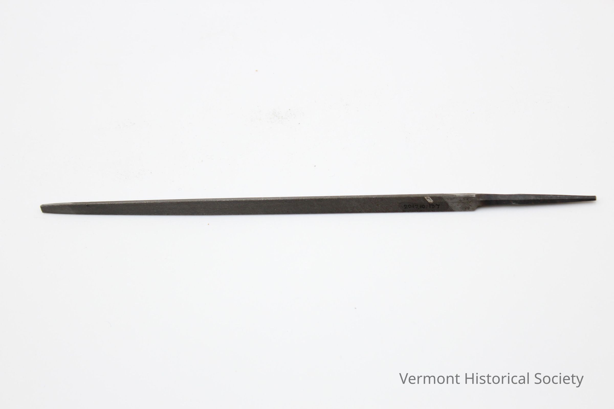 Triangular metal file, no handle; overall length = 7 5/8" ; three manufacturer's marks on heel, above tang: Nicholson - Made in U.S.A. - Warranted.Context