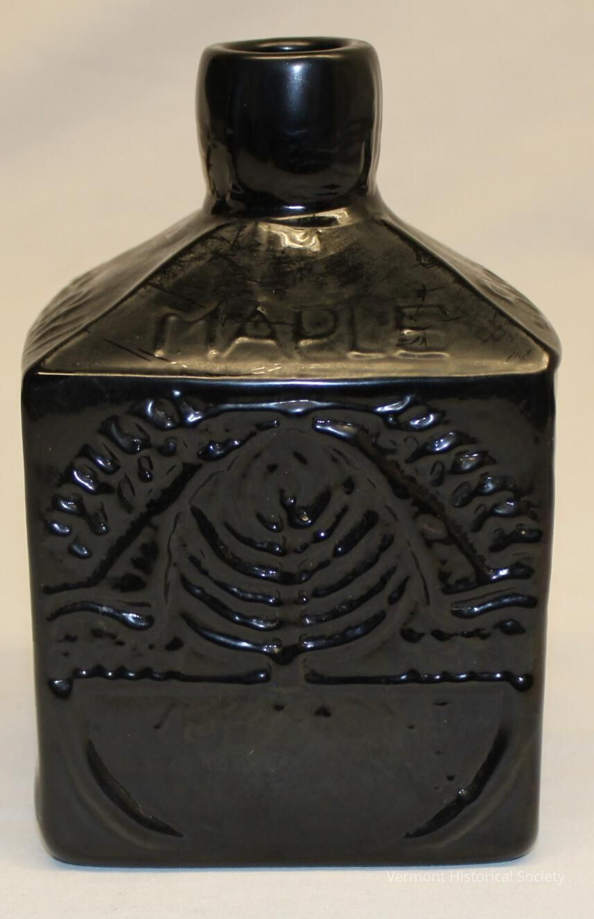 Square, green glass bottle with unique molded images on each side: "1776 / 1976" within a ribbon; a maple leaf; a simplified version of the Vermont state seal with the inscriptions "VERMONT" and "FREEDOM AND LIBERTY"; and four stars above a paper label. The paper label reads, "The Vermont Bicentennial Bottle / Designed and hand blown by Vermont Craftsmen, this bottle commemorates Vermont's unique role int he history of this nation. It is made entirely from recycled glass , suing a hand carved graphite mold and employing techniques of early American glass blowers. / VERMONT GLASS HOUSE, INC. CABOT, VERMONT 05647" with the Vermont Bicentennial logo. The bottom is scratched with the inscription, "Vermont Glass House Inc. First Day 3-19-75".Context