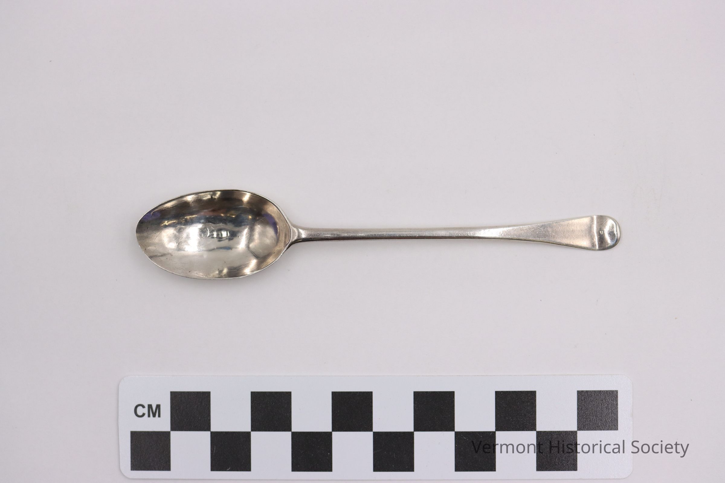 Small coin spoon with SW engraved on the back of the handle. Fiddle handle, no shoulders, end is tipped up. The back of the spoon has a tiny plume of feathers at the terminal of the handle. Marked "H&C" 1/2" from terminal of the handle. The SW engraving is at the tip, underside of the handle and is rather primitive. There is a period after the S but nothing after the W.Context