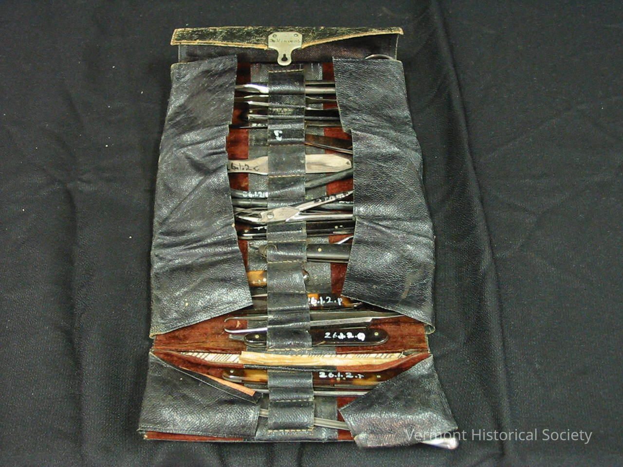 Black leather tool case. The case rolls up to close and secures with a metal latch. The latched is etched with the name, "Dr. Vincent". The interior is lined with red velvet, and there is a pocket beneath the lining at one end that reveals striped silk lining. There is a black leather strip with leather loops along it, each of which holds a surgical instrument. The instruments include knives, scissors, tweezers, hooks, scoops, probes, needles, and thread (21 total).Context