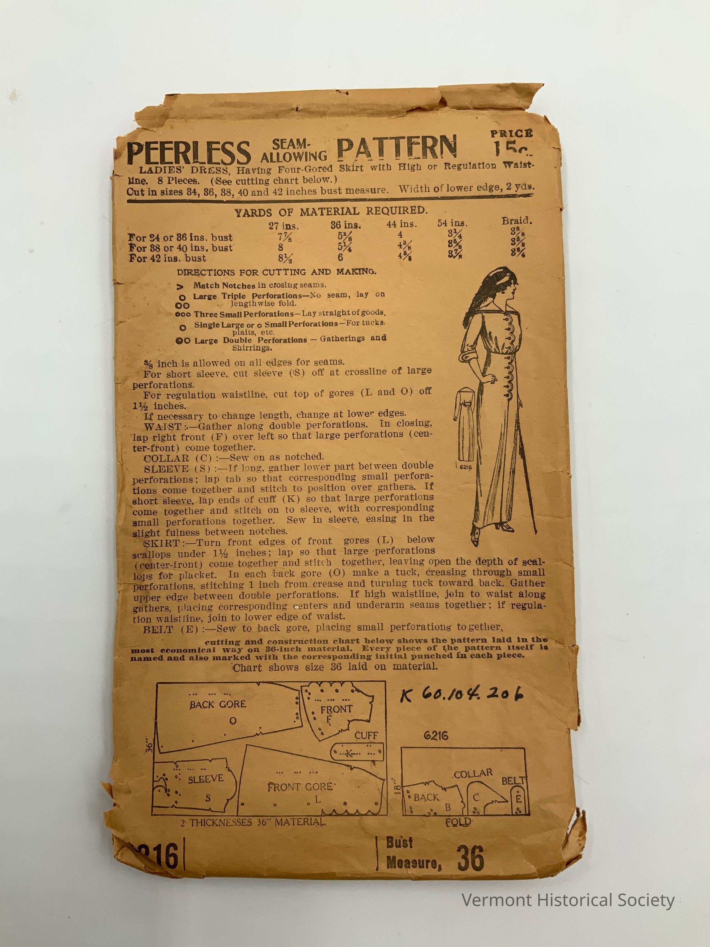 Cut tissue paper sewing pattern in a commercial envelope. The front of the envelope is printed with brand information ("PEERLESS PATTERN"), sewing instructions, a cutting diagram, and an illustration of the finished garment. The garment is a dress with a sailor collar, center front opening, and long skirt.Context