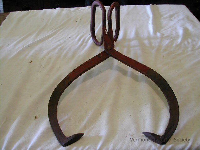 Hand-forged iron ice tongs consisting of two metal rods connected at a hinge in the center. The handles are ovals, and the tongs arch outward before coming inward near the end. The end of each side is bent into a point.