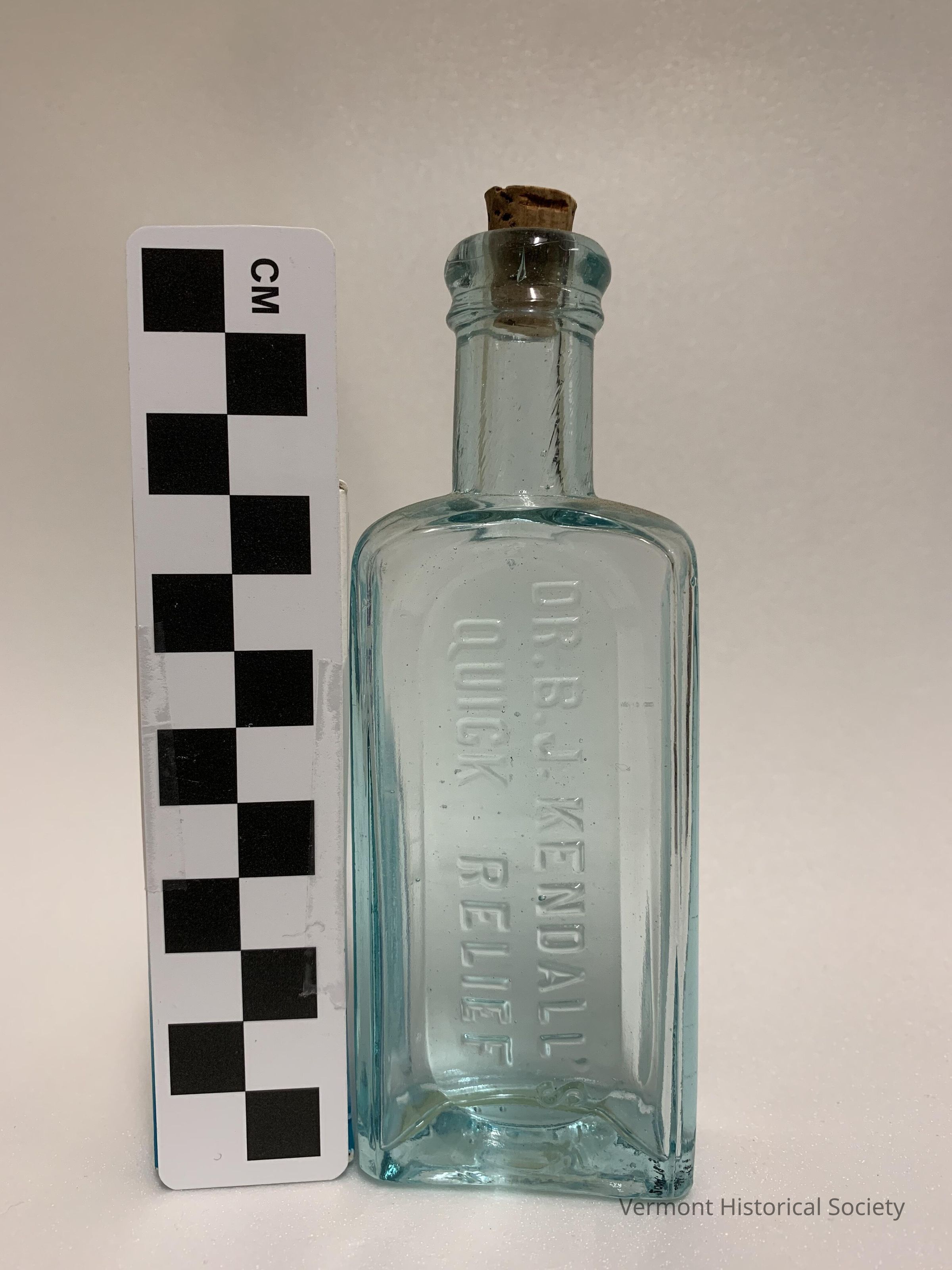 Green molded glass bottle bearing the molded inscription, "DR. B. J. KENDALL'S/QUICK RELIEF." A paper sticker on the base bears the inked inscription, "5/10/71 / Lepine / Morrisville / 3-". A cork stopper is still present.