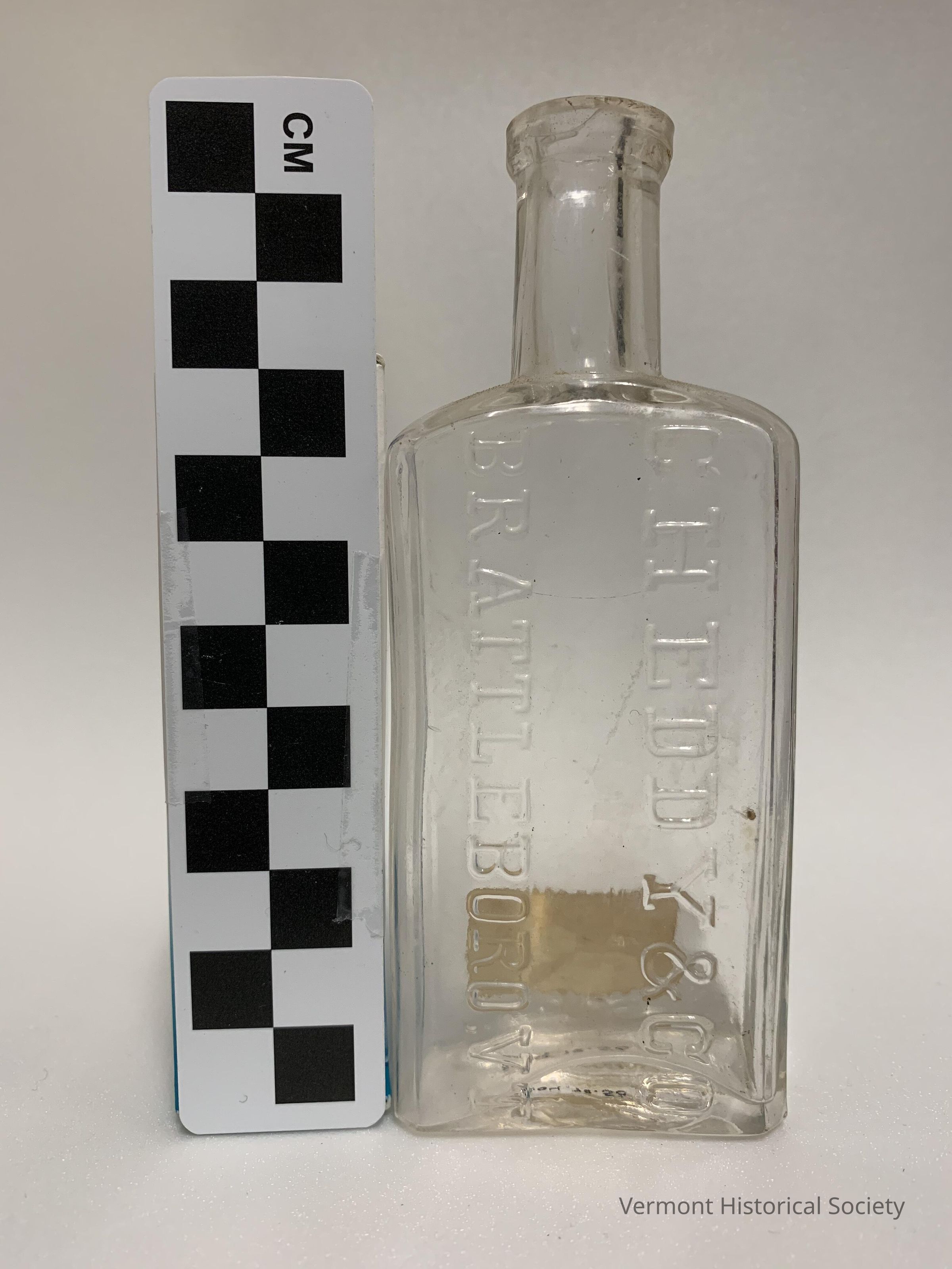 Clear molded glass bottle bearing the molded inscription, "C. H. EDDY & CO/BRATTLEBORO, VT". A paper sticker on the reverse bears the blue inked inscription, "1/25/70/50[cent symbol]/East Greenluse/ny".