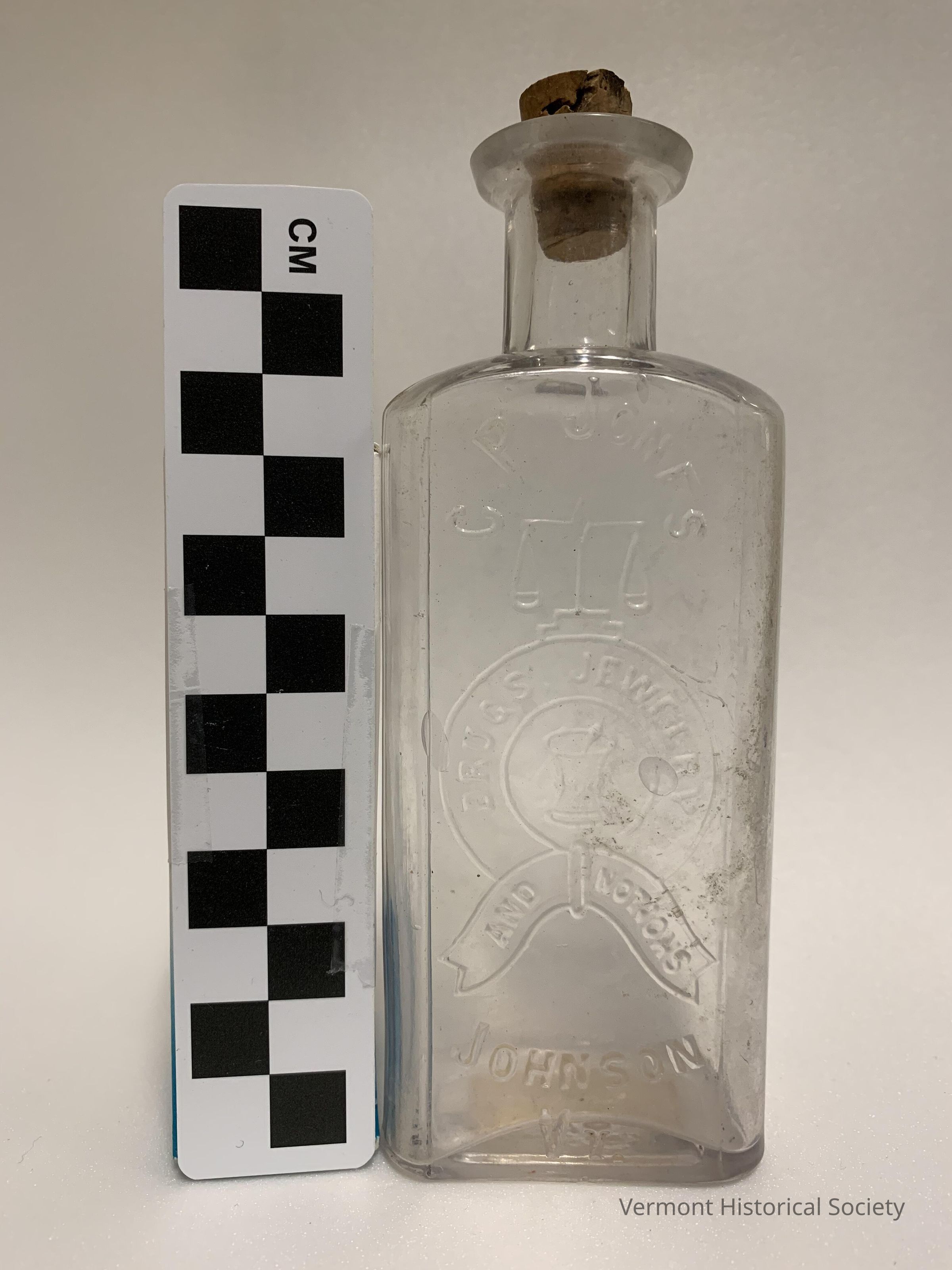 Clear molded glass bottle bearing the molded inscription, "C. P. JONES/DRUGS, JEWELRY, AND NOTIONS/JOHNSON VT." The inscription surrounds and fills out an image of a mortar and pestle surrounded by a round ribbon that is tied together at the bottom, surmounted by a scale. A paper sticker on the base bears the inked inscription, "5/10/71/Lepine/150". A cork stopper is still present.
