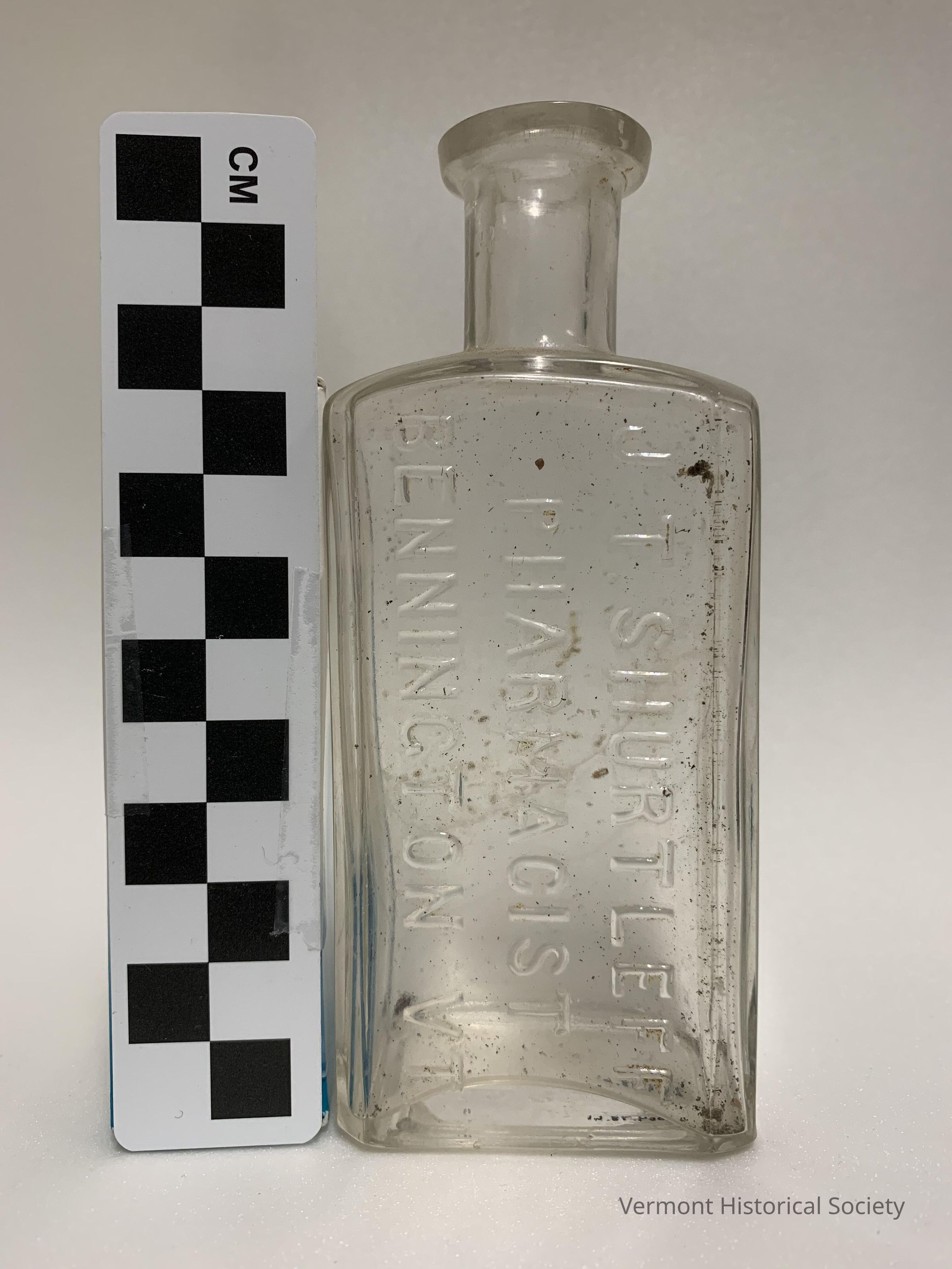 Clear molded glass bottle bearing the molded inscription, "J. T. SHURTLEFF/PHARMACIST/BENNINGTON VT."
