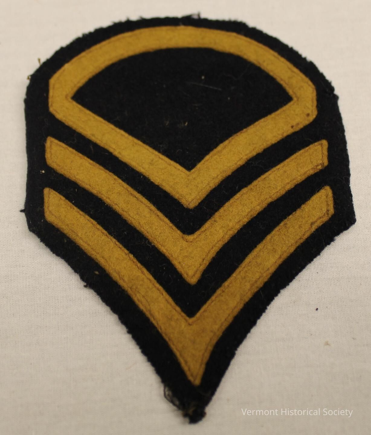 Wool felt insignia patch consisting of two yellow chevrons beneath a yellow wedge with a rounded top. The design is appliqued on a black felt ground.