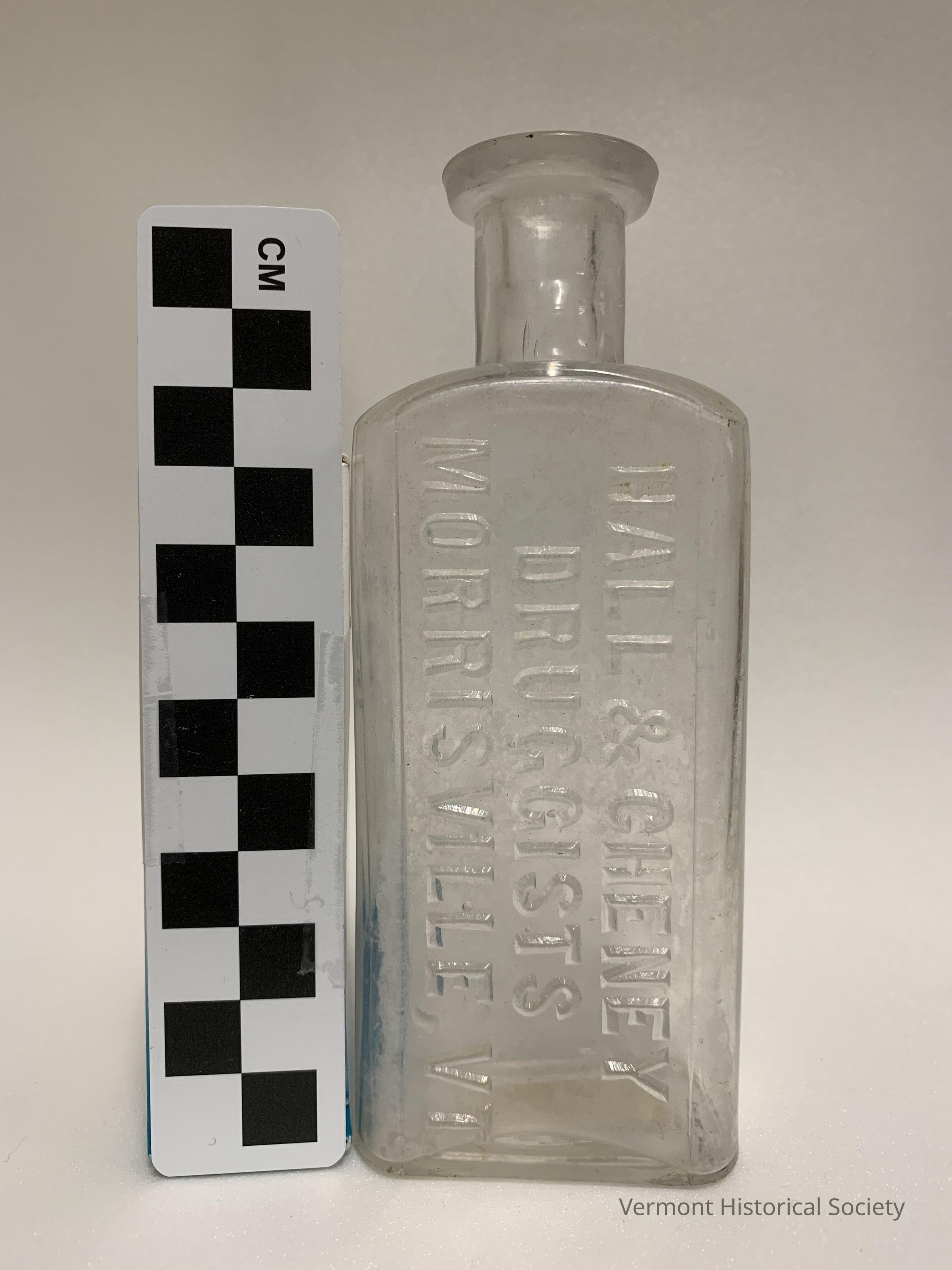 Clear molded glass medicine bottle bearing the molded inscription, "HALL & CHENEY/DRUGGISTS/MORRISVILLE, VT." A paper sticker on the base bears the inscription, "5/10/71/Lepine/150". The glass is heavily clouded with glass disease on the interior.