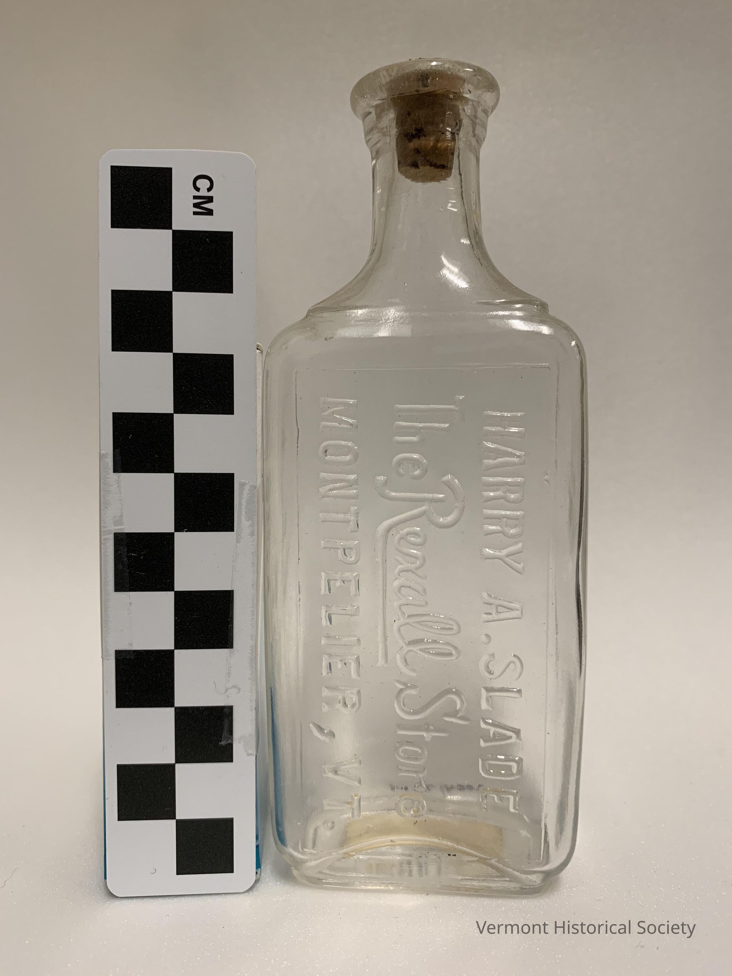 Clear molded glass bottle with the molded inscription, "HARRY A. SLADE/The Rexall Store/MONTPELIER, VT." A paper sticker on the base bears the inked inscription, "5/10/71/Lepine/Morrisville/150." Cork stopper still present.
