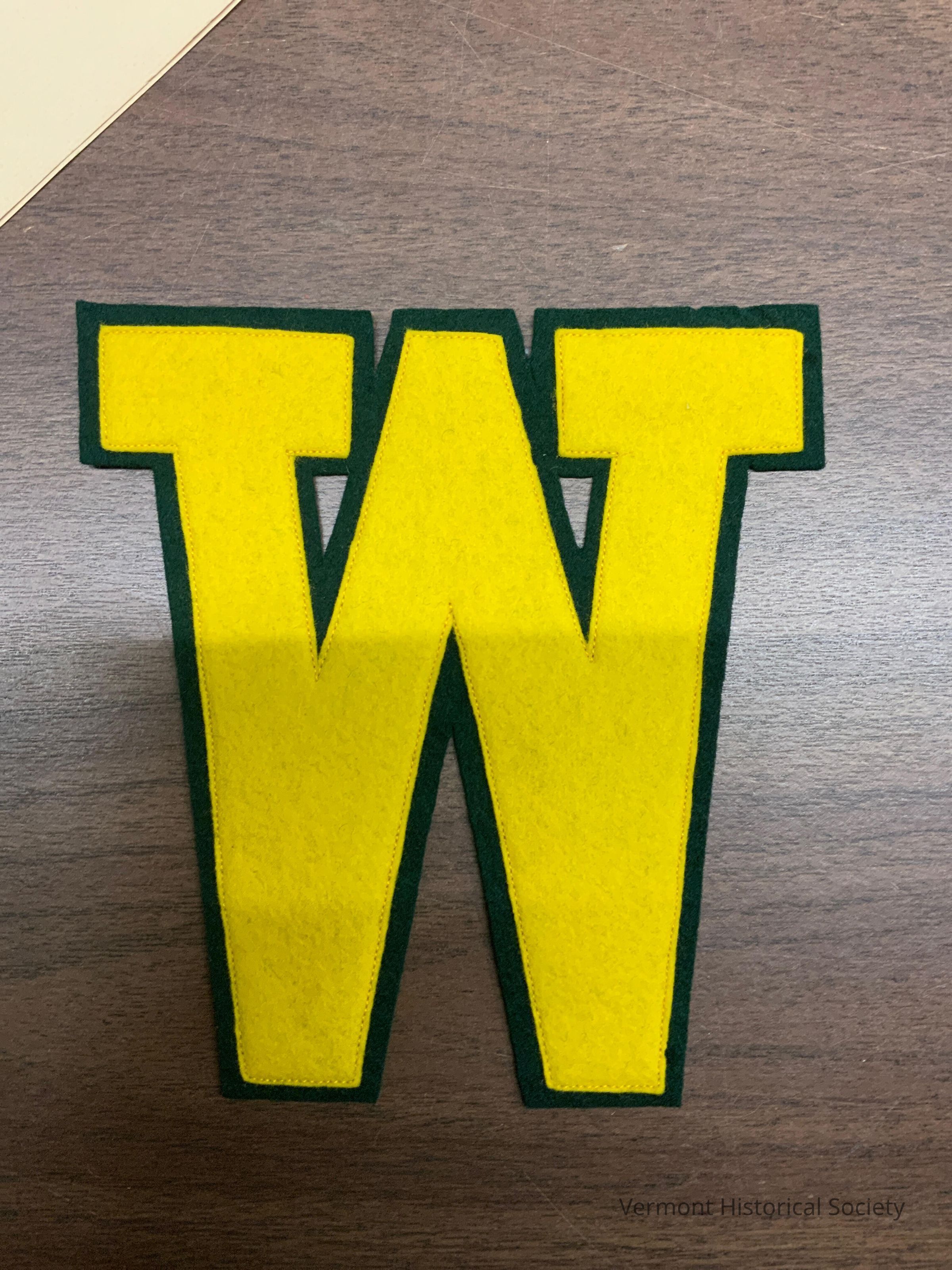 Yellow felt W on a green felted ground. The W has rectangular serifs on either end.
