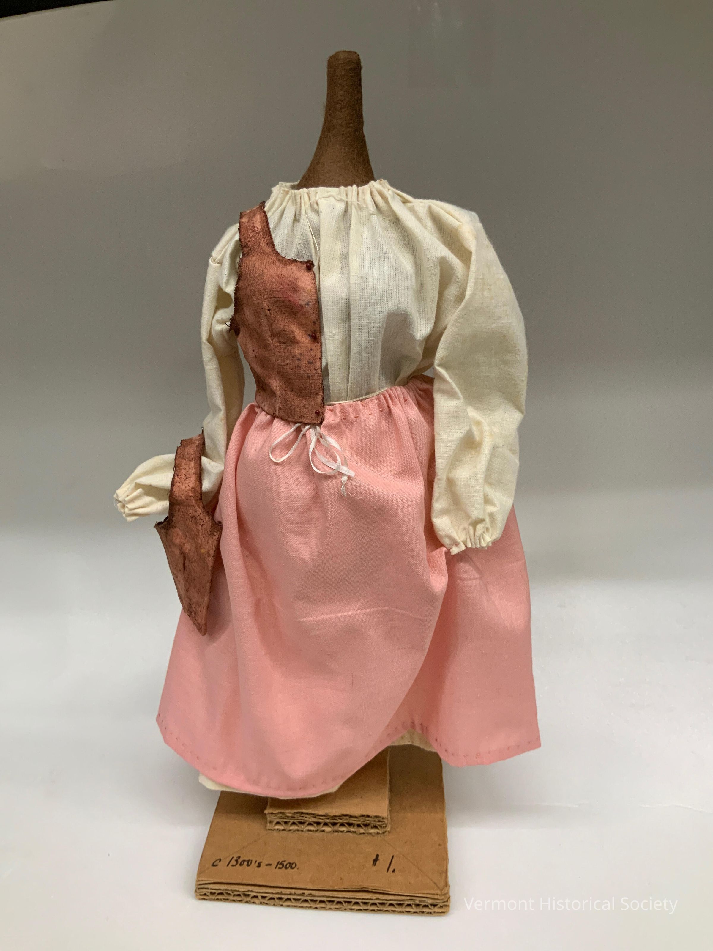 Miniature brown felt dress form wearing a white cotton shift, pink cotton petticoat, and pink cotton bodice. The bodice has been stiffened with glue (now darkened). Half the bodice is stitched to the bottom of one of the sleeves of the shift to appear as if it's being held. The other sleeve is pinned to the petticoat as if lifting it up.
