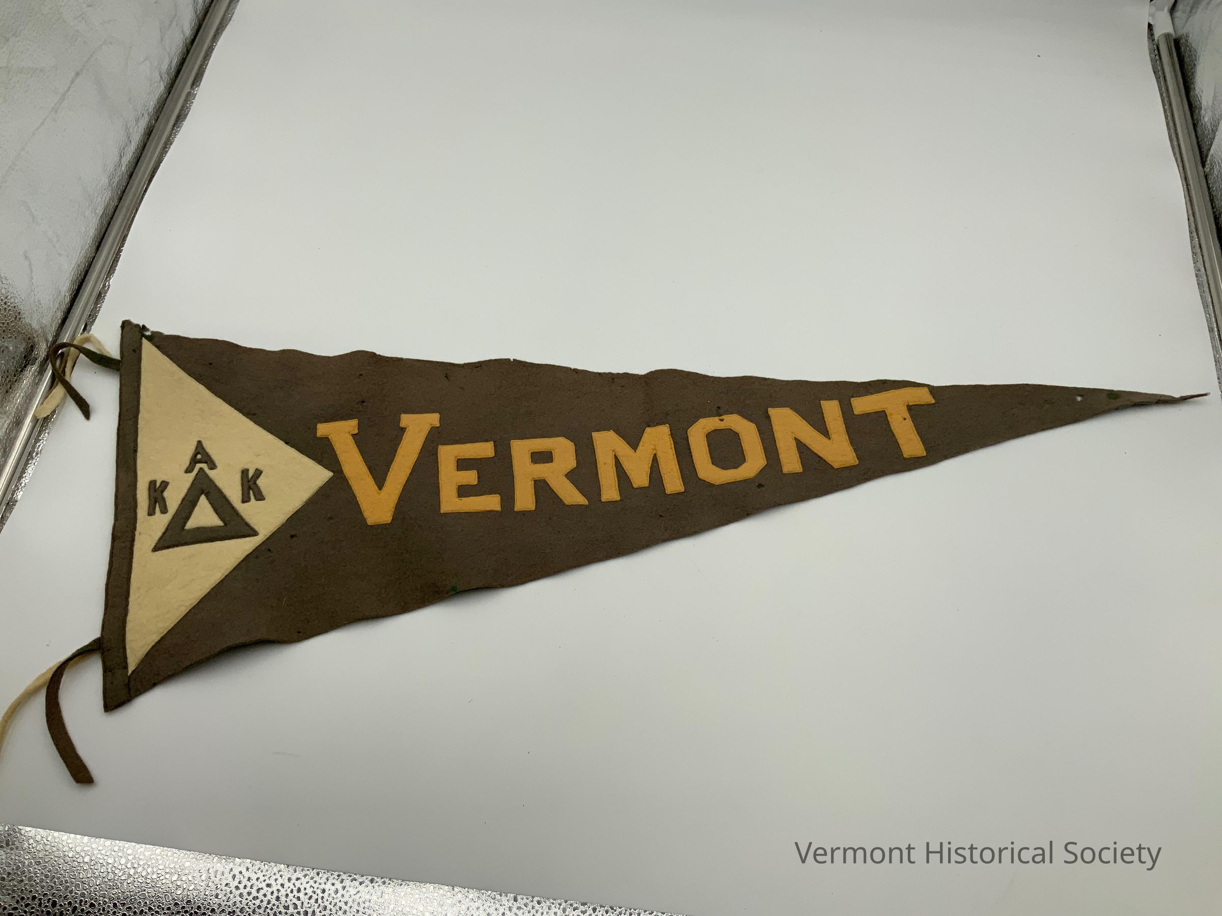 Significantly faded green pennant with the word "Vermont" spelled in gold and at the biggest end, a white triangle with the initials AKK around a faded green triangle. AKK stands for Alpha Kappa Kappa, a medical school fraternity founded at Dartmouth College in 1888. There was a chapter formed at the University of Vermont in 1894 called the Delta chapter and the green triangle is the Delta symbol in the Greek alphabet. The fraternity disbanded nationally in the 1960s.Context