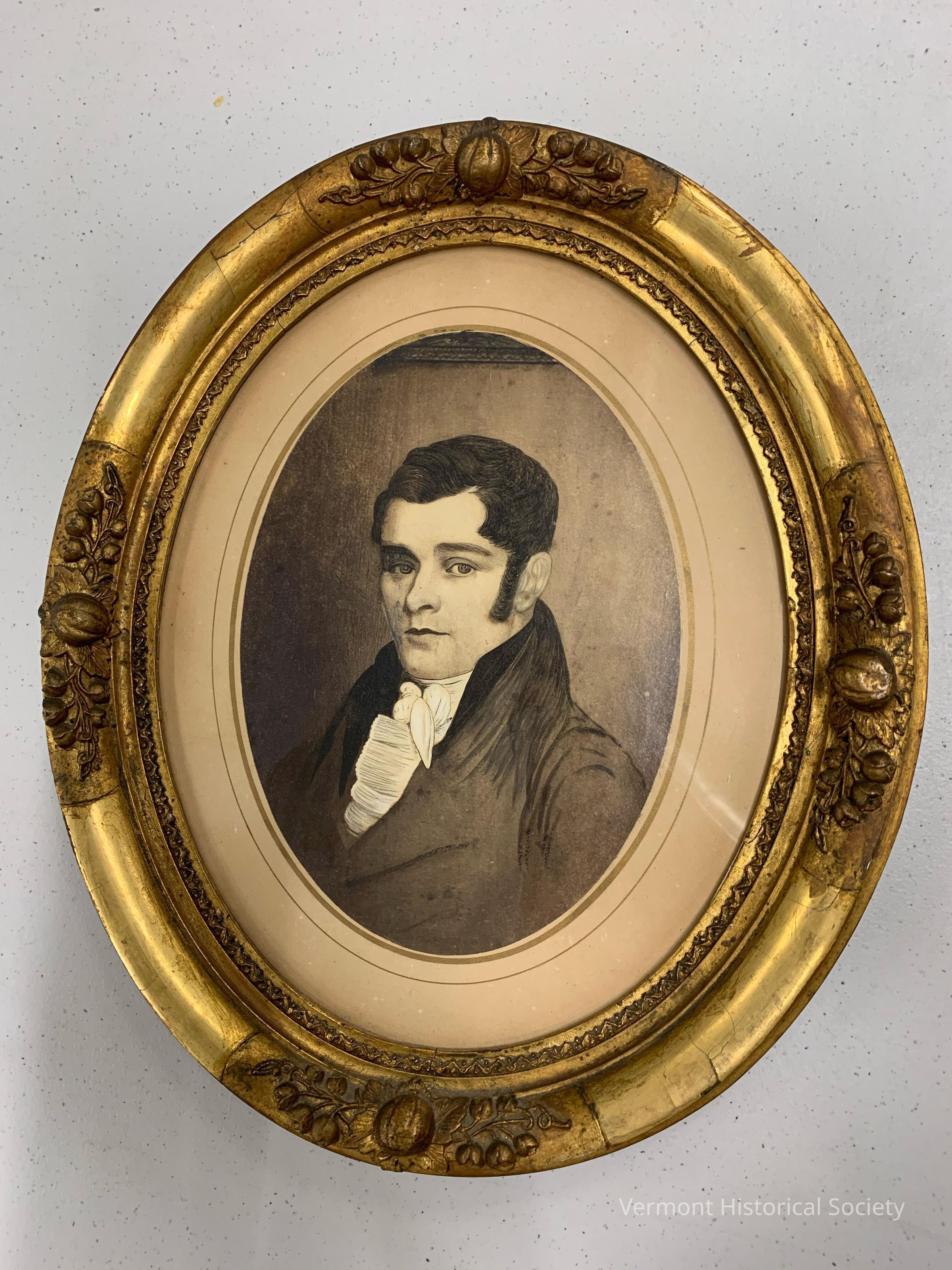 Photograph of a painted portrait showing a young man wearing a high-collared suit with a white cravat. He has dark hair and long sideburns. The photograph has been enhanced with watercolor paint. The portrait is cut in an oval and pasted onto a white mat, with two lines of gilding tracing the outline of the applied portrait. The whole is framed in a gilded oval frame embellished on the top, bottom and sides with molded melons and vines.
