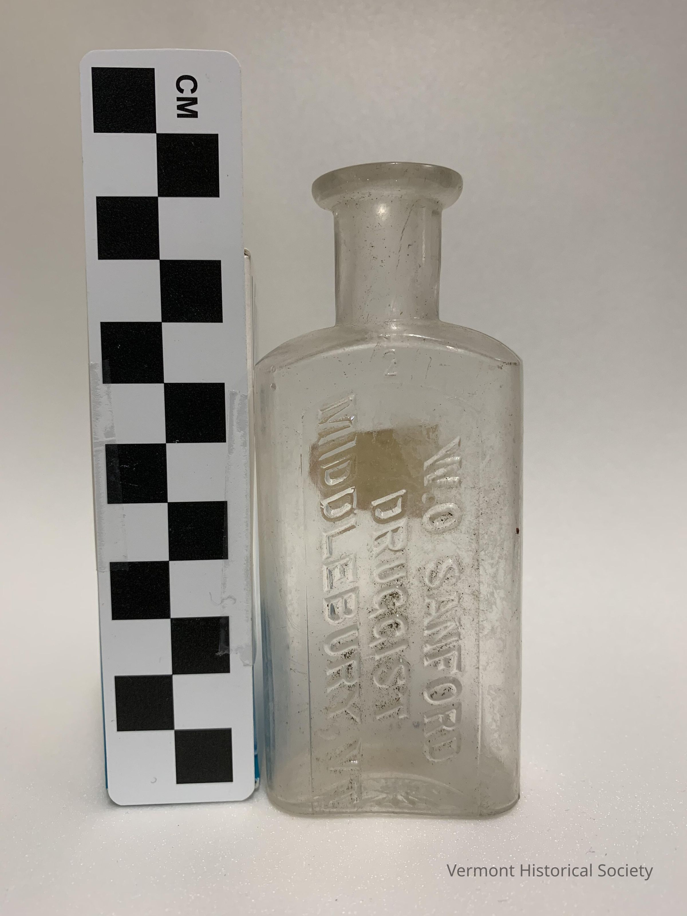 Clear molded glass bottle bearing the molded inscription, "W.O. SANFORD/DRUGGIST/MIDDLEBURY, VT." A paper sticker on the reverse created from the corner of a larger, red-bordered sticker bears the inked inscription, "Zern/$1.00/9/1/72" in two different hands.