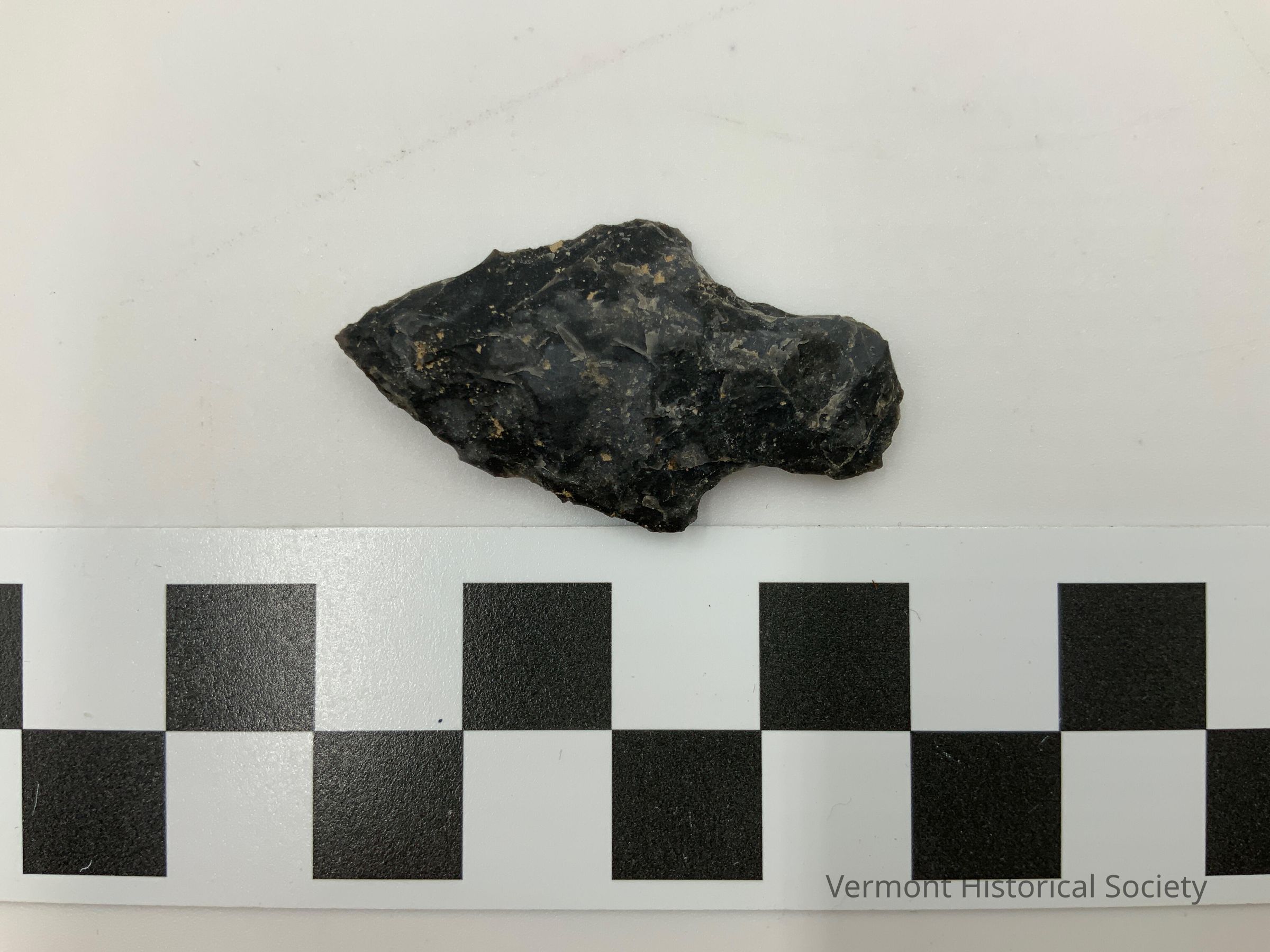 Black chipped stone projectile point with a straight stem. The blade edges are asymmetrical and curve outward slightly. The base is thinned and curves outward.Context