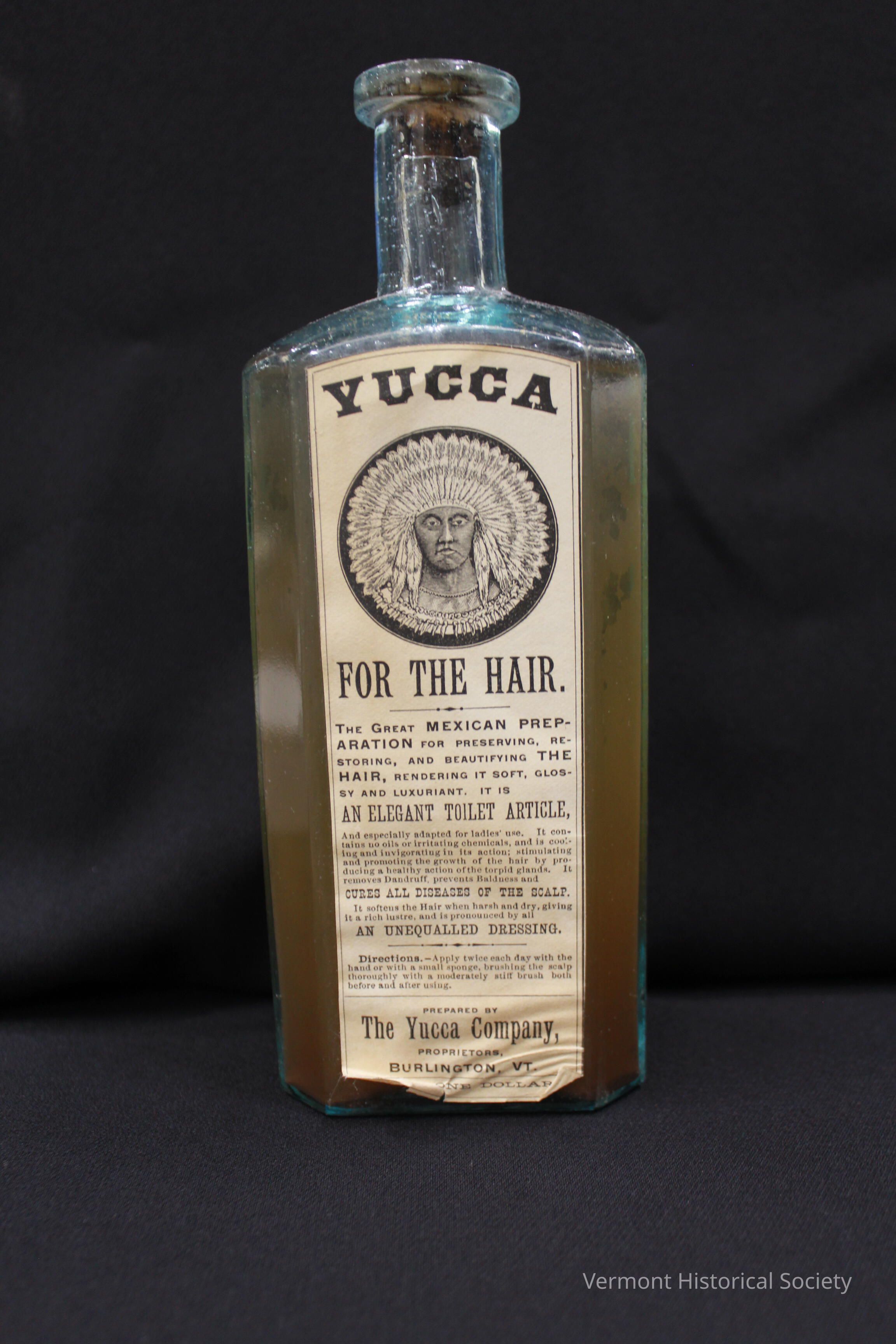 The bottle is accompanied by a white cardboard box printed with the image of an indigenous American woman wrapped in fabric with braided hair reading her thighs. The box reads, "YUCCA THE GREAT MEXICAN PREPARATION FOR THE HAIR", along with claims about what the treatment can cure.Context