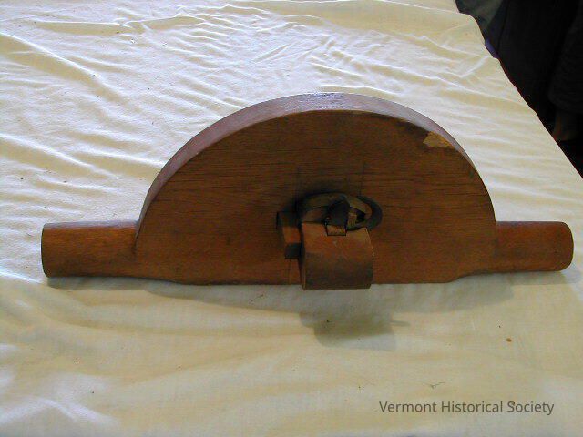 Wooden tool with an inserted blade. The tool is semicircular with round handles at each end. A semicircular fence protrudes from base and contains a hook and 2 parallel cutting blades for making the groove.