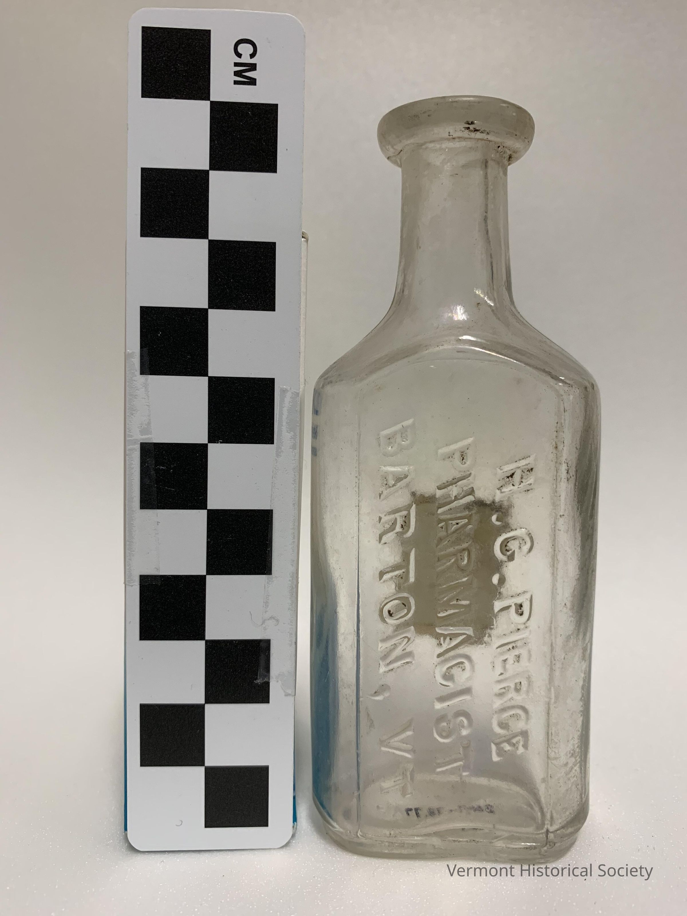 Clear molded glass bottle with flat face and slight rounded reverse. The face bears the molded inscription, " H. C. PIERCE/PHARMACIST/BARTON, VT." A paper sticker on the reverse bears the inked inscription, "6/20/72/Stocker".