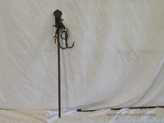 Metal balance scale consisting of a bar with three hooks at the one end. The counterweight is missing.