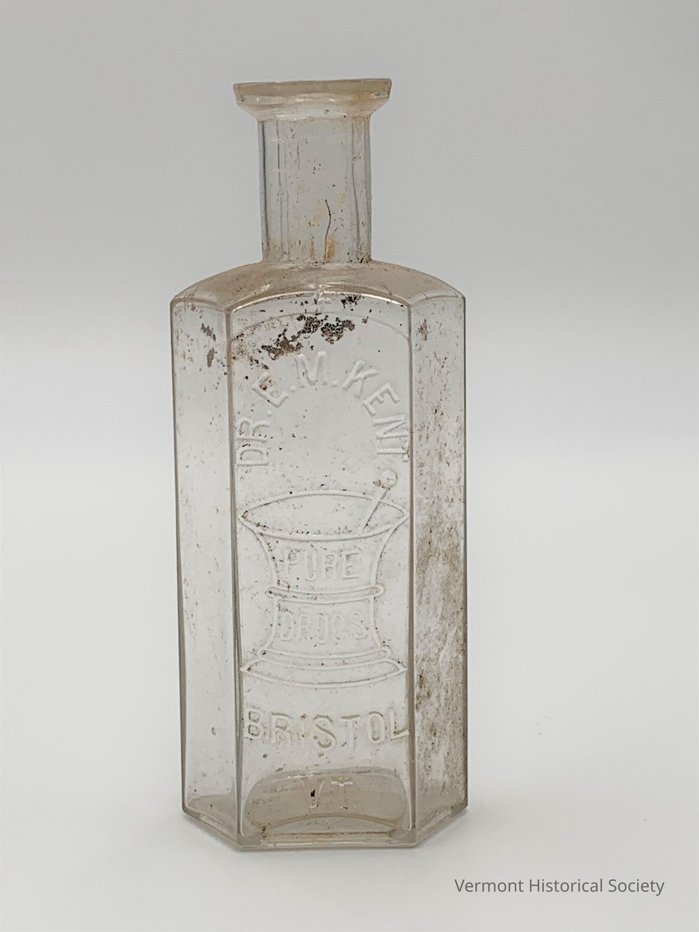 Clear molded glass bottle bearing the molded inscription, "DR. E. M. KENT/BRISTOL/VT." surrounding an image of a mortar and pestler with the inscription, "PURE DRUGS". A paper sticker on the base bears the inked inscription, "3/25/72/Stan/Smith". The molded maker's inscription on the base is partially obscured by the sticker, but what is visible reads, "D. F. & D."Context