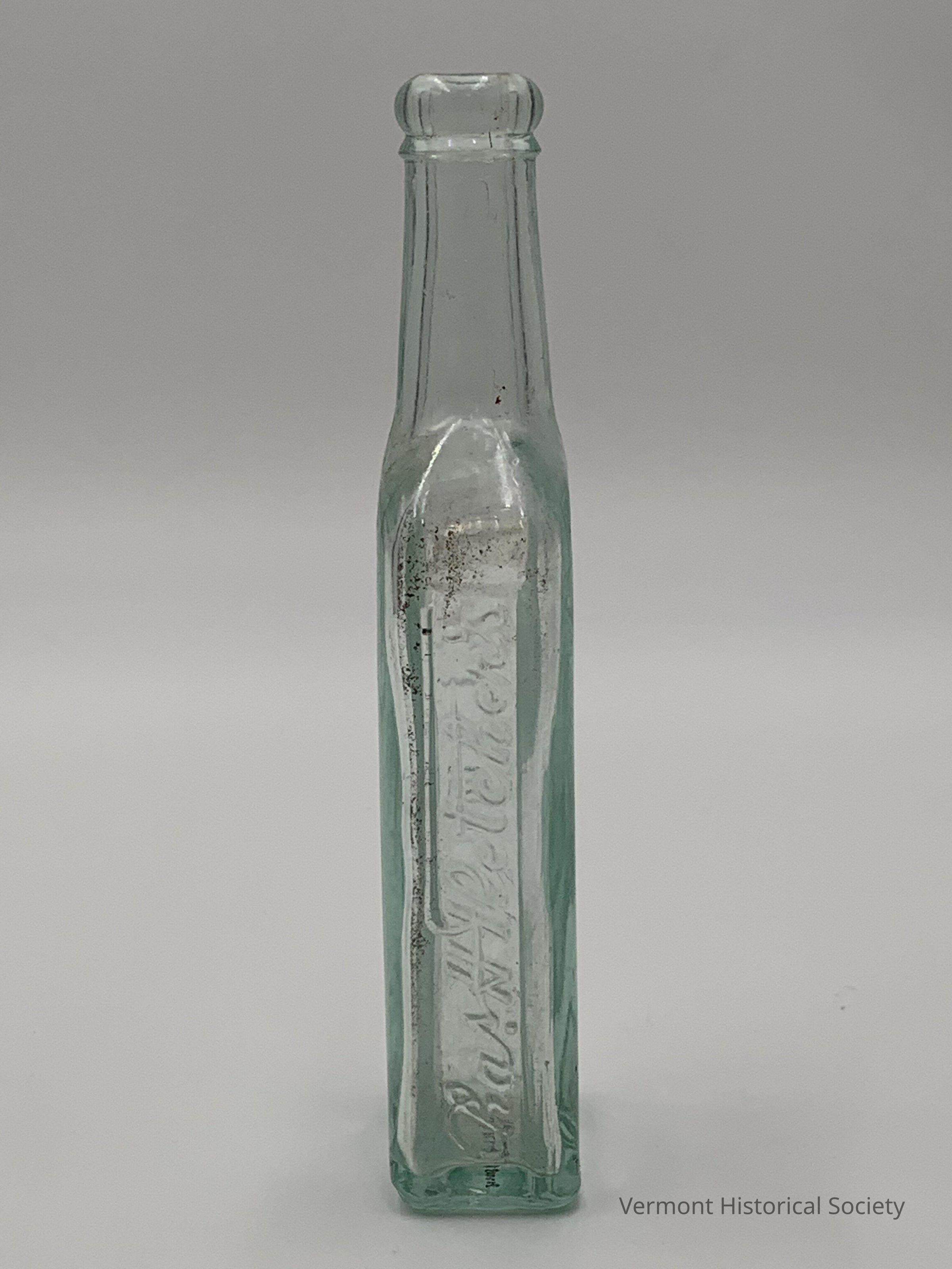 Rectangular, green molded glass bottle bearing the molded inscriptions, "Chas. H. Fletcher's" and "CASTORIA" on the sides. A P within a circle and a 7 are molded into the base.