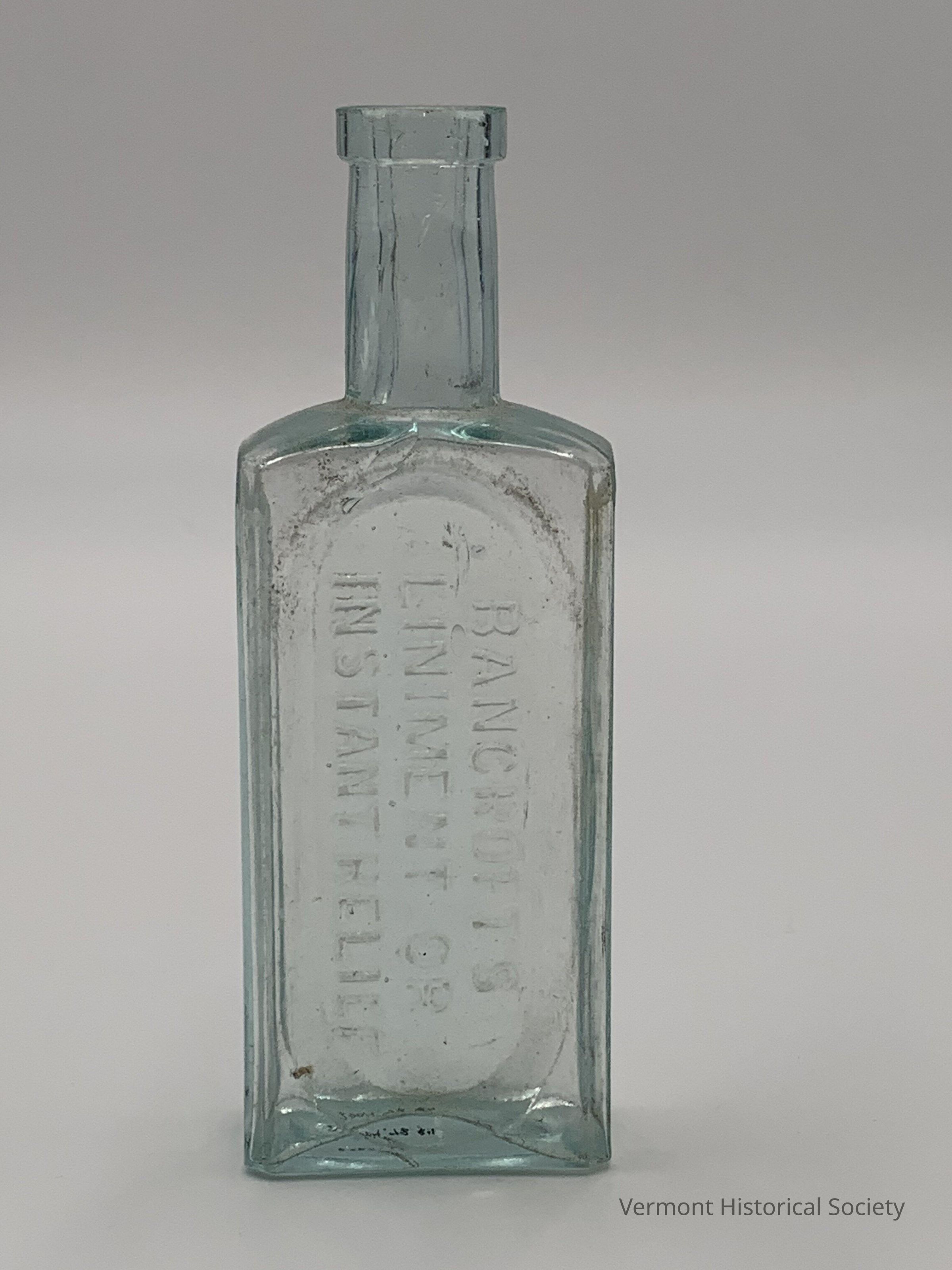 Rectangular, green molded glass bottle bearing the molded inscription, “BANCROFT’S LINIMENT OR INSTANT RELIEF”, on the front, and "MARSHFIELD VT" and "D. W. BANCROFT" on the sides.