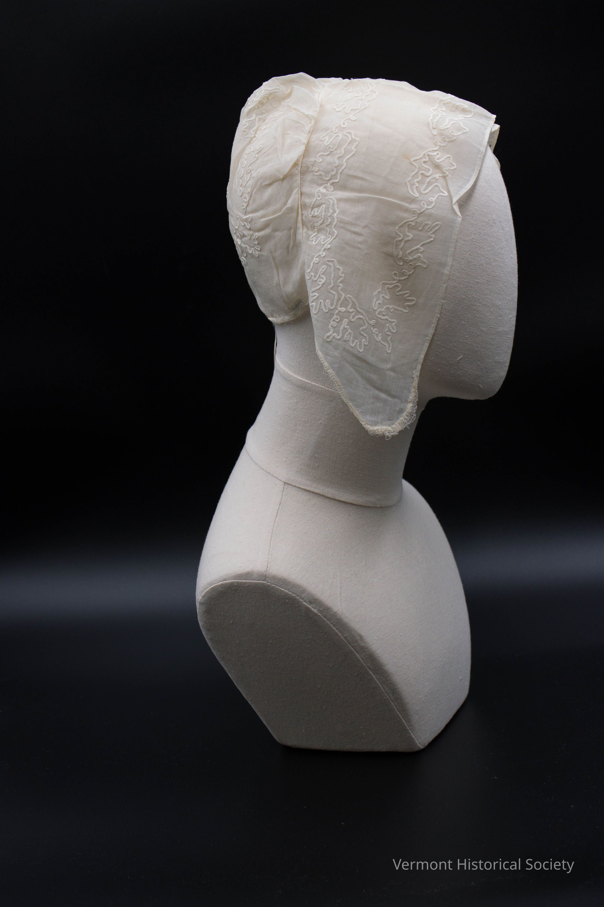 Sheer white cotton cap decorated with couched braid. The cap is constructed in two parts: the crown and the brim. The crown is gathered at the top center and has a narrow drawstring along the bottom edge. The brim angles downward at the sides. Both parts have the couched decoration in a pattern of vine leaves.