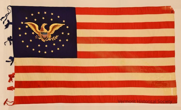 1st Vermont Infantry Regiment national flag. It consists of a horizontally red-and-white striped field with 7 red stripes and 6 white stripes. There is a blue canton in the upper left corner with a hand-painted gold eagle with a federal shield over its chest carrying arrows and an olive branch. There are 7 ties on the left edge in red and blue.
