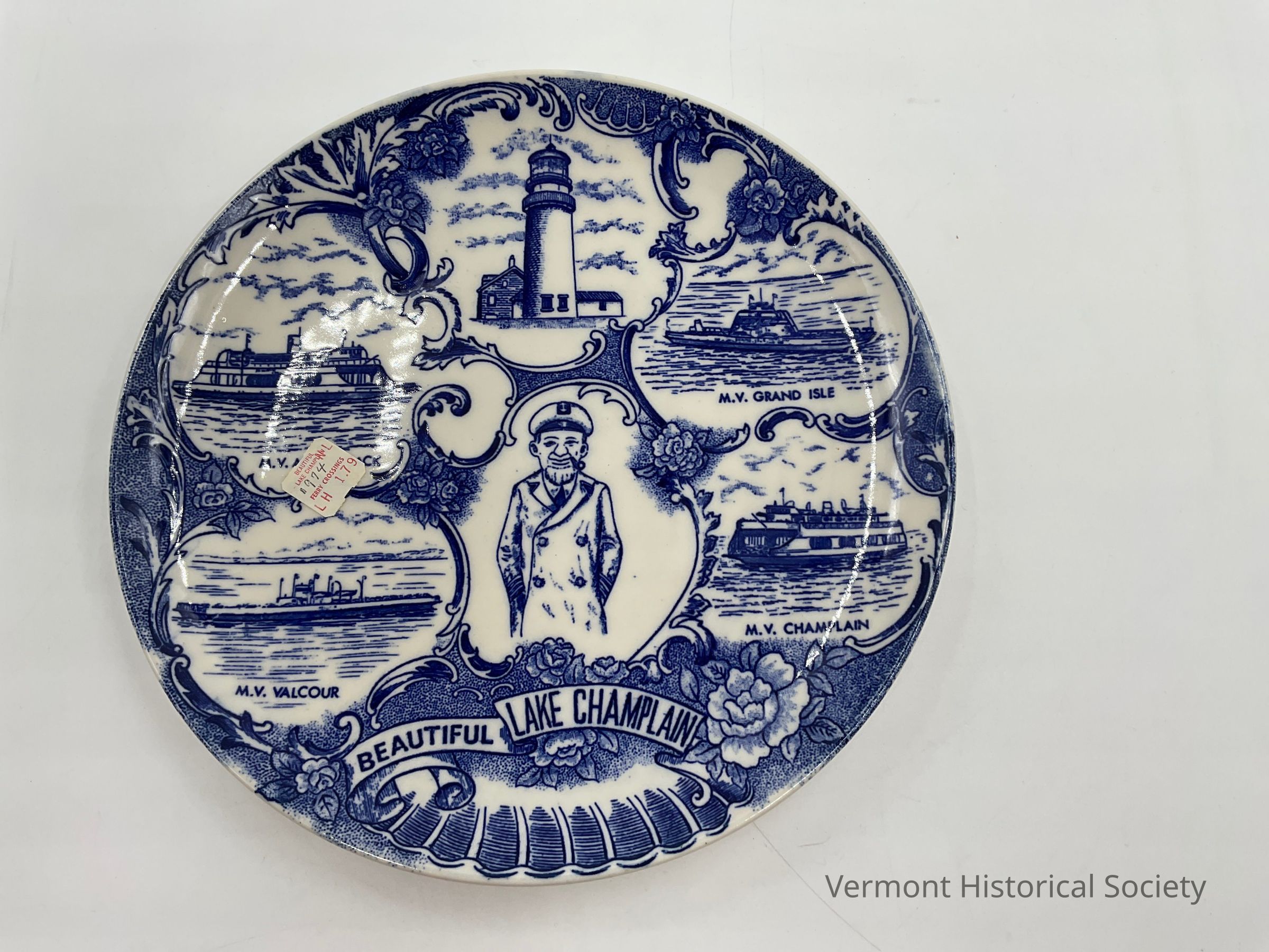 The item being described is a souvenir plate with a blue-and-white color scheme. The plate features nautical scenes depicted in vignettes, bordered with rococo swirls. Among the scenes on the plate are a ship captain in the center, surrounded by four ferry ships, and a lighthouse positioned at the top center. At the bottom center of the plate, there is an inscription that reads "BEAUTIFUL LAKE CHAMPLAIN" within a banner.Acquisition