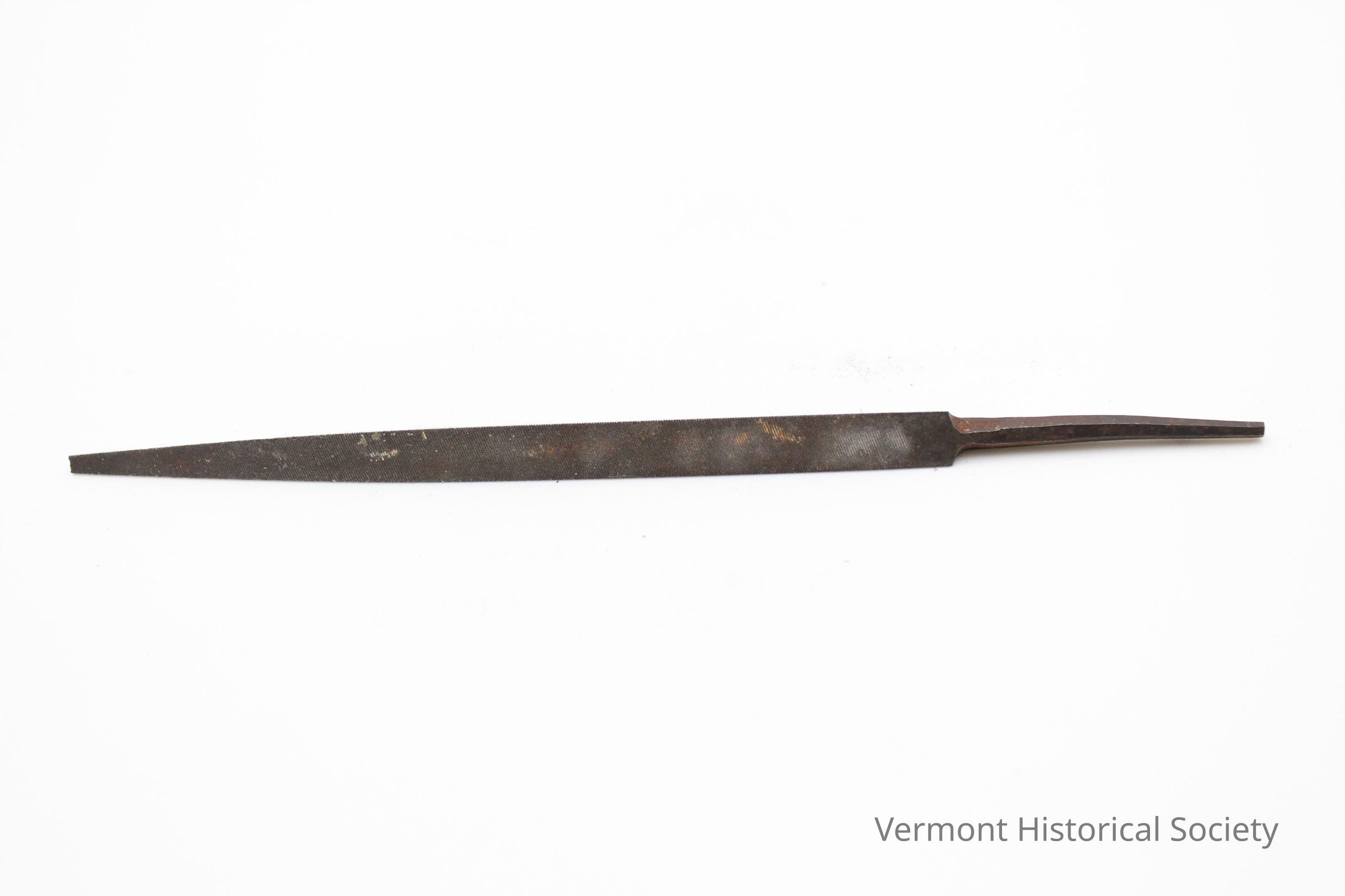 Triangular file, no handle, slightly tapered point; overall length = 6 9/16"; no manufacturer's mark.Context