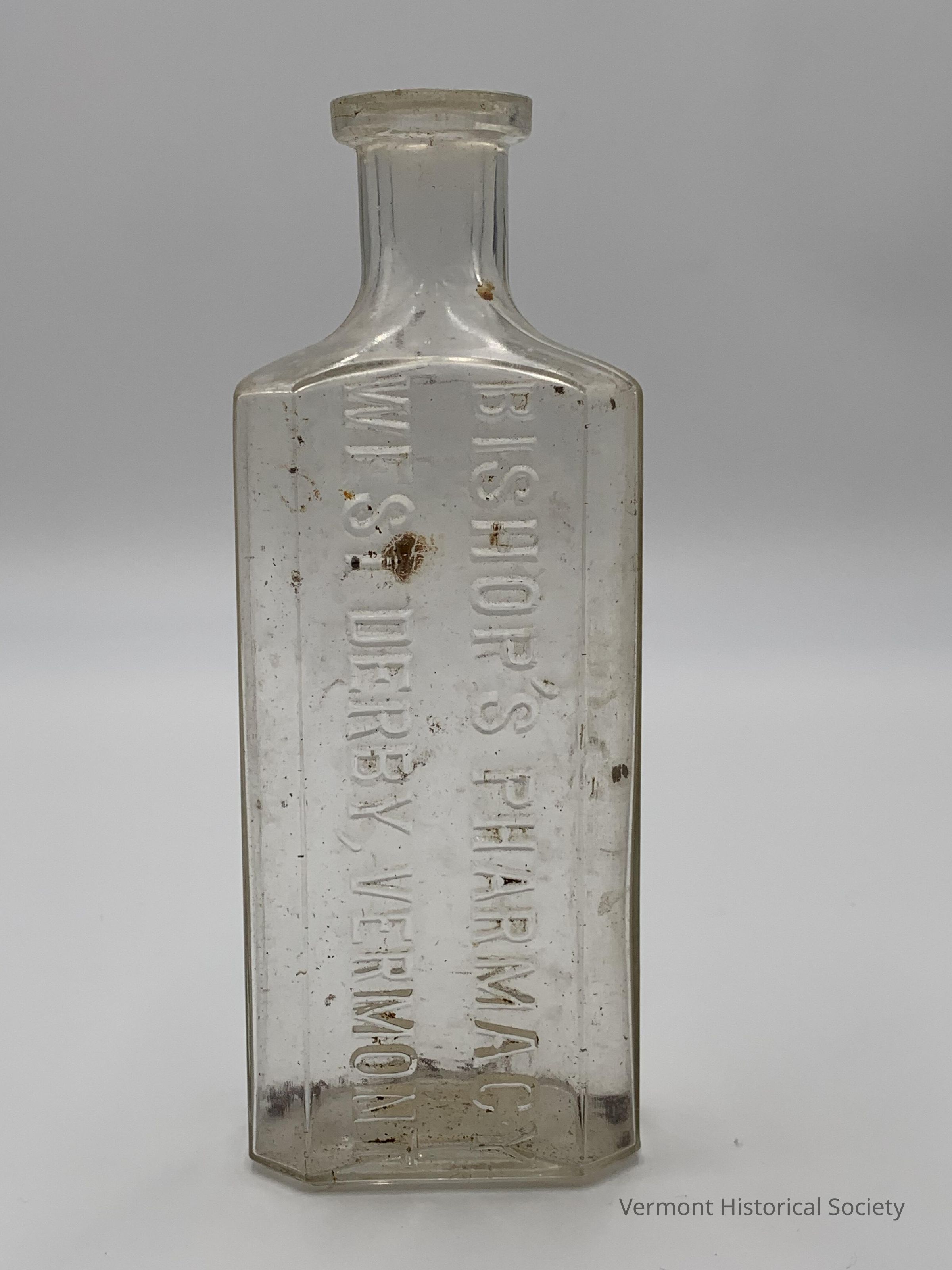 Clear glass bottle with the molded inscription, “BISHOP'S PHARMACY WEST DERBY, VERMONT".