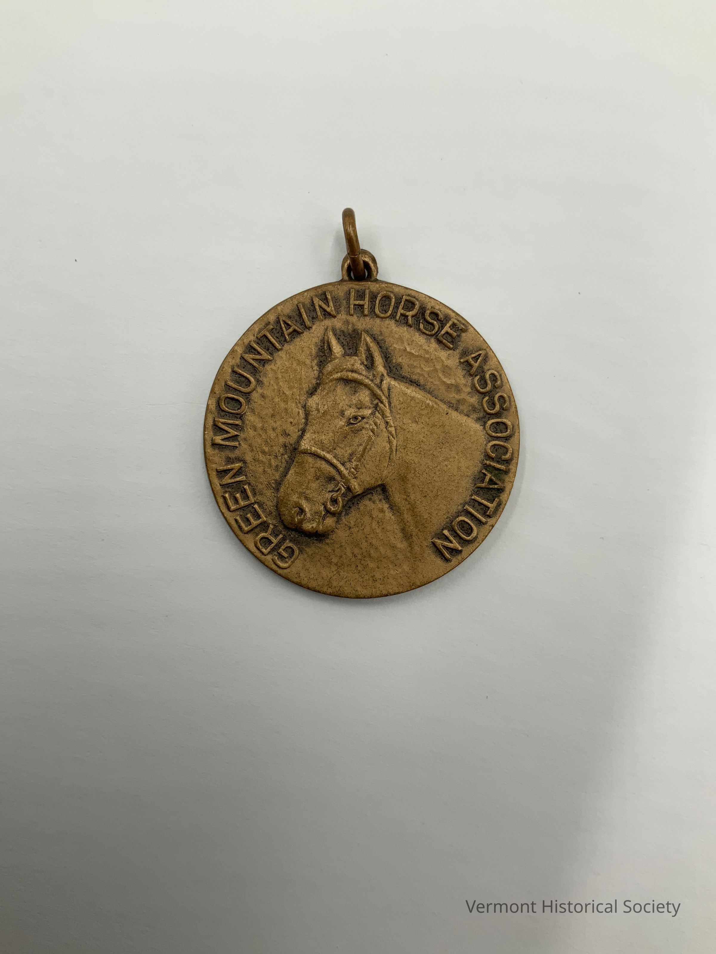 Round metal medallion molded on one side with the head of a horse and the inscription, "GREEN MOUNTAIN HORSE ASSOCIATION", and on the other side with the inscription, "100-MILE TRAIL RIDE 1940". There is a round eye ring at the center top.