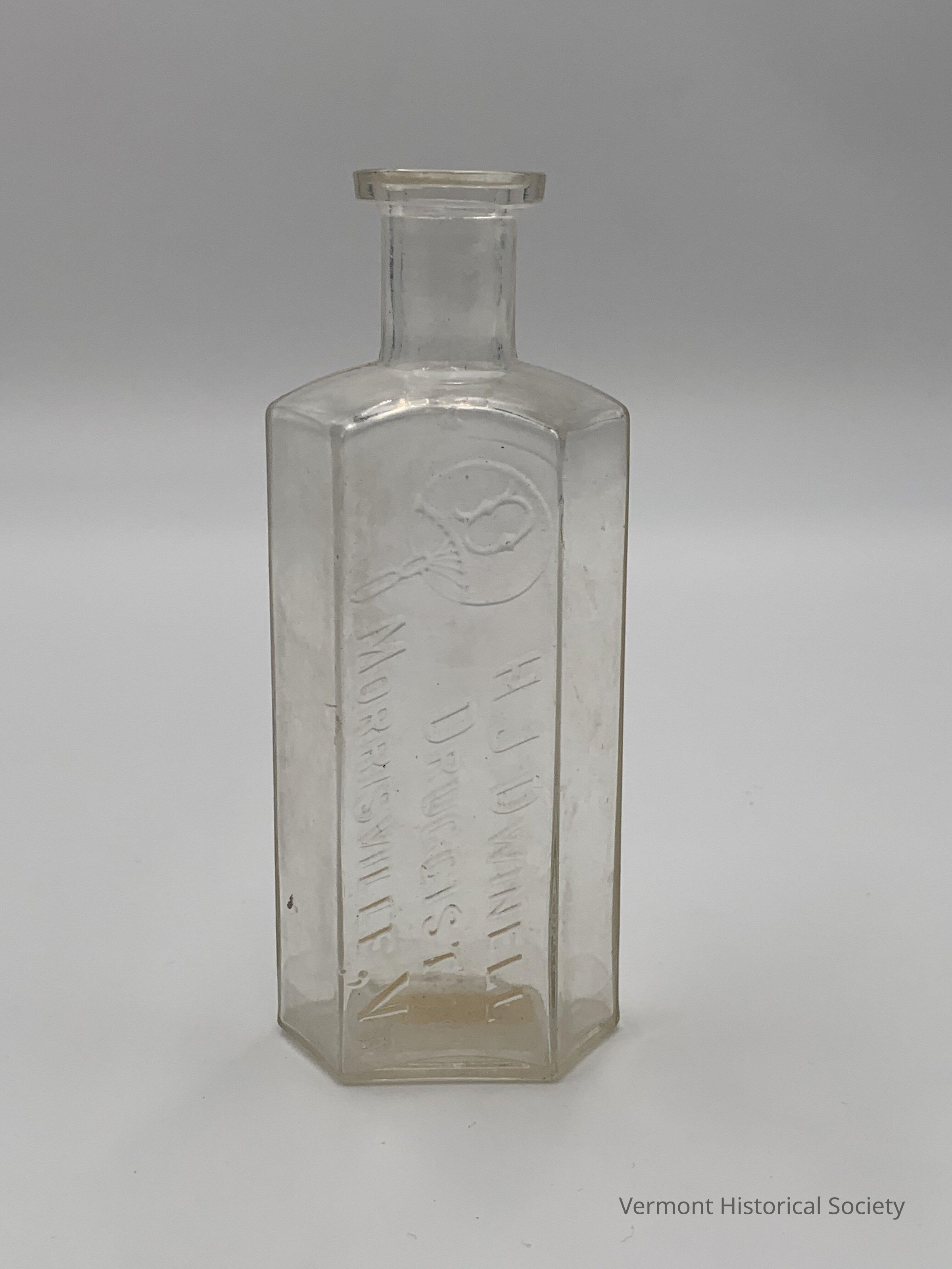 Clear molded glass bottle bearing the molded inscription, "H.J.DWINELL/DRUGGIST/MORRISVILLE, VT." along with an image of a circular, Japanese-style fan with a D inside.