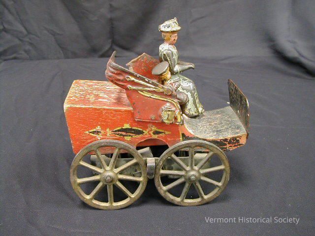 Painted cast-iron toy car. The car is painted red with black and yellow decorations on the sides. It sits on 4 high wheels. There is a woman and young boy seated on the bench, and the woman is posed as if holding reins.Context