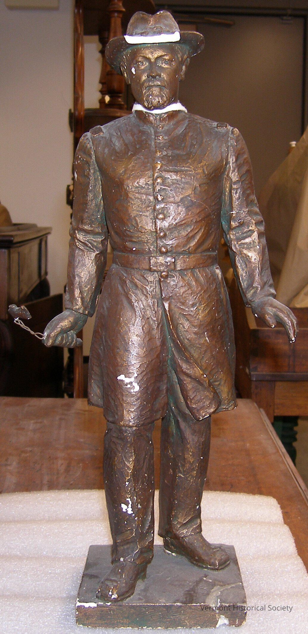 Plaster figure showing a man in a military uniform holding a hatchet. He is wearing a brimmed hat and has a goatee. His uniform is of the style worn during the Civil War. The hatchets handle consists of two twisted-together wires. The figure is panted to resemble bronze.Artwork Details